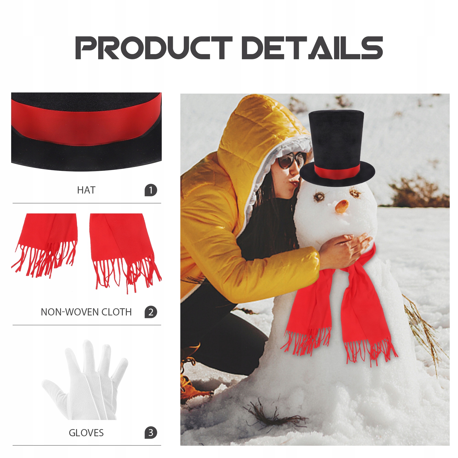 - 1 × шляпа снеговика (черный фетровый цилиндр)