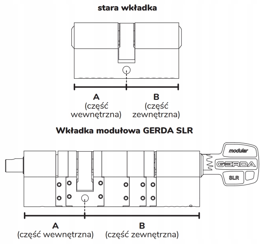 Чтобы правильно сложить модульную вставку Gerda, измерьте размер старой вставки. Минимальный и максимальный размер модульной вставки Gerda SLR соответствует диаграмме и таблице ниже. Вставка находится на SO -названном Zabierak. В нашем предложении, наборы с вставкой также работают на SO -названной передаче, то есть предназначенной для двери с многокачественной системой закрытия.