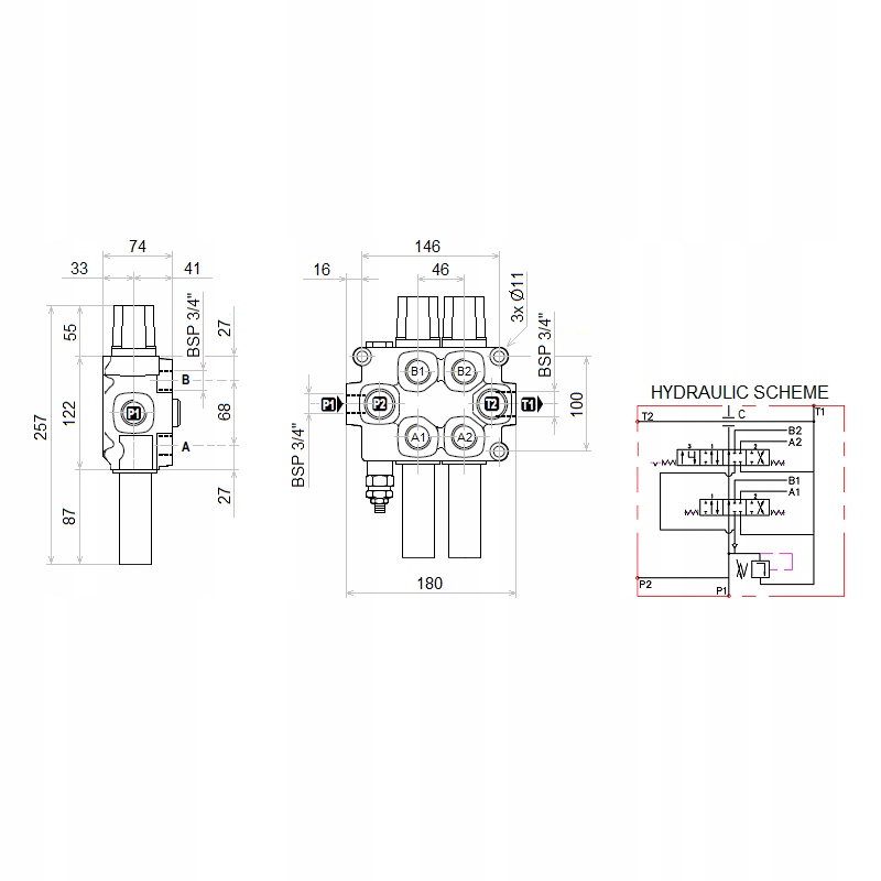 2 разделов контрольный комплект. Джойстик Indemar с кнопкой кнопкой + две ссылки длиной 1,5 метра + гидравлический дистрибьютор Galtech, двойное сечение с емкостью до 120 л/мин с одним плавающей секцией.