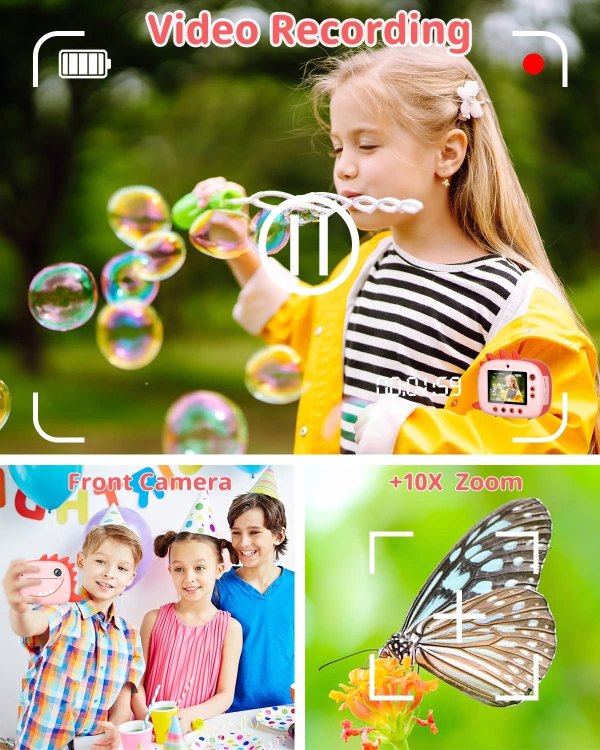 Эта цифровая детская камера может записывать 12-мегапиксельные фотографии и HD-видео 1080p. Это идеальная отправная точка для детей, чтобы заняться хобби фотографией или улучшить свои навыки фотографии. (Эта камера является детской игрушкой, не сравнивайте справочные данные с профессиональной камерой)