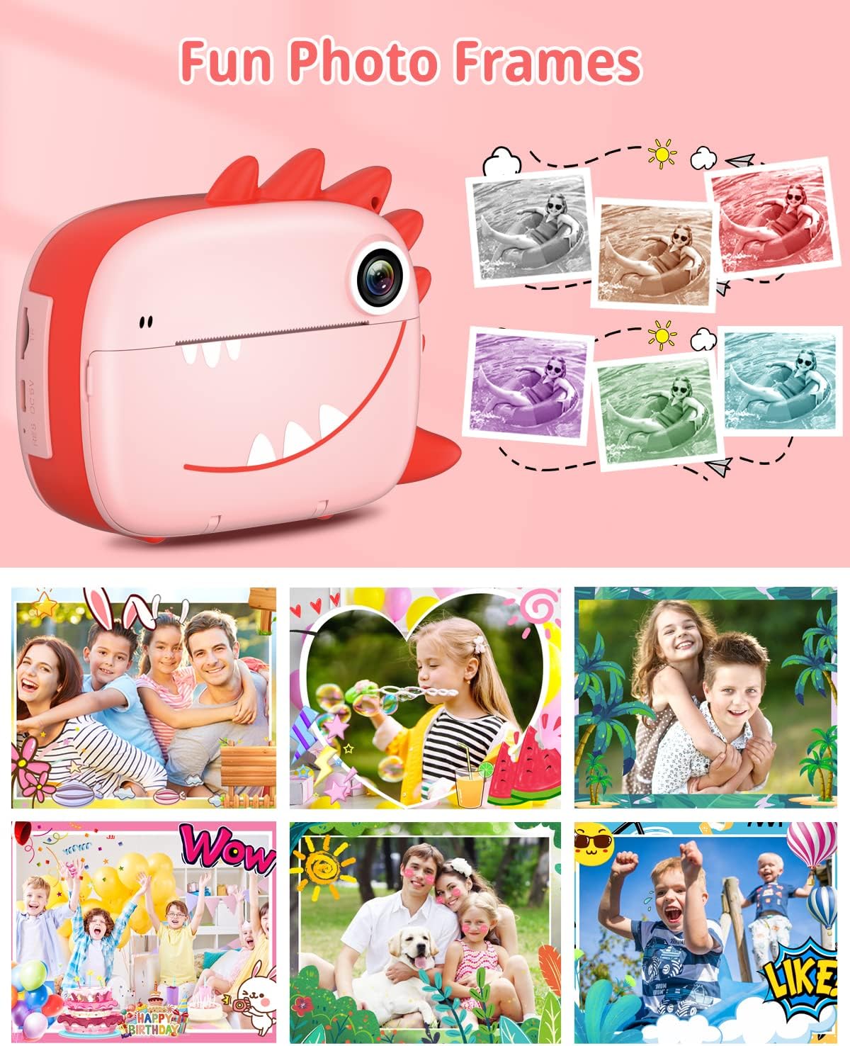 Камера быстрой печати для детей оснащена большим экраном 2,4 дюйма и использует бесшумную технологию термопечати, поэтому дети получают свои черно-белые фотографии за считанные секунды. Уникальный дизайн с узорами динозавров, оставьте их в стороне. Дополнительно предлагаем 3 рулона бумаги для детских принтеров. между «попробовать печать» или «режимом съемки», нажав кнопку «Печать».