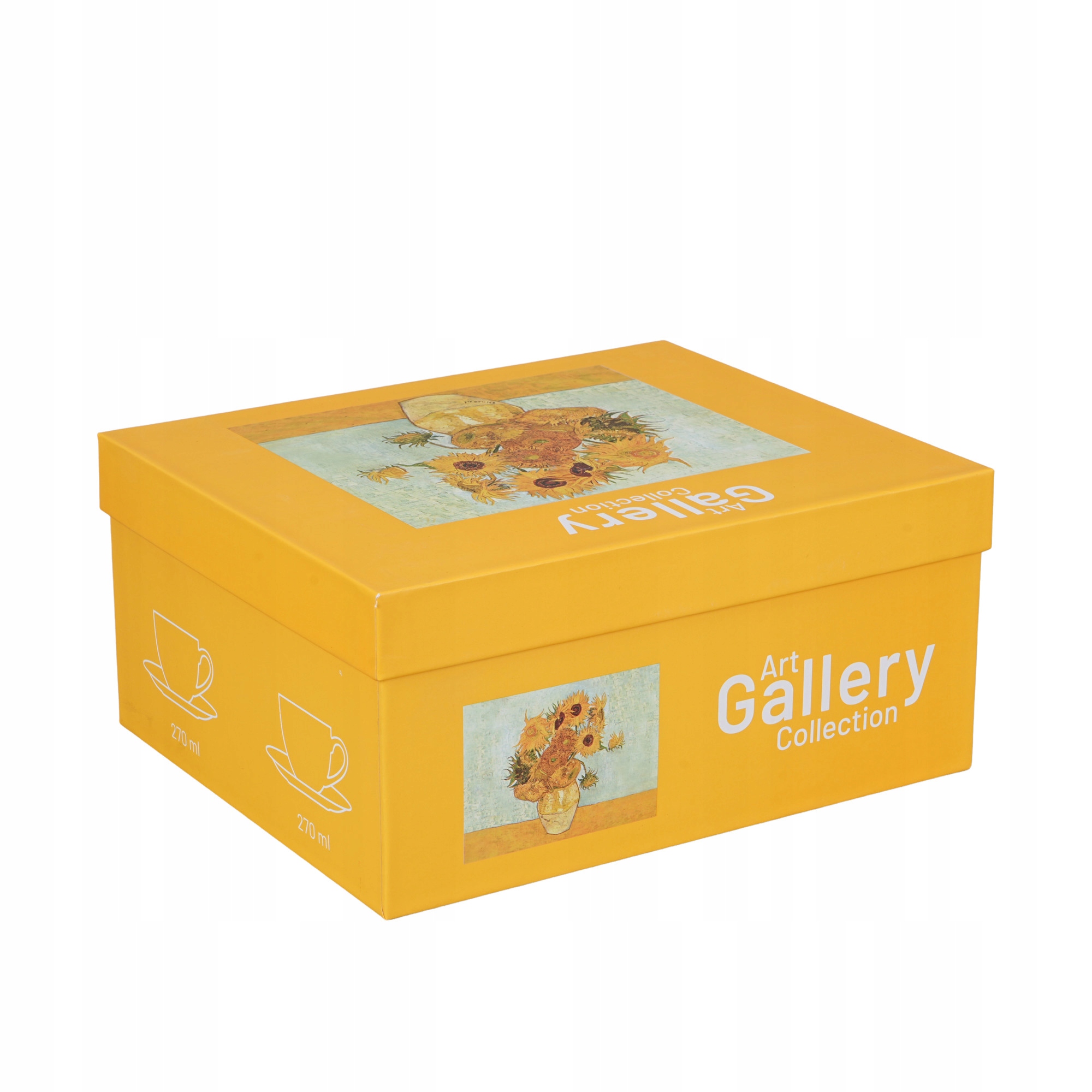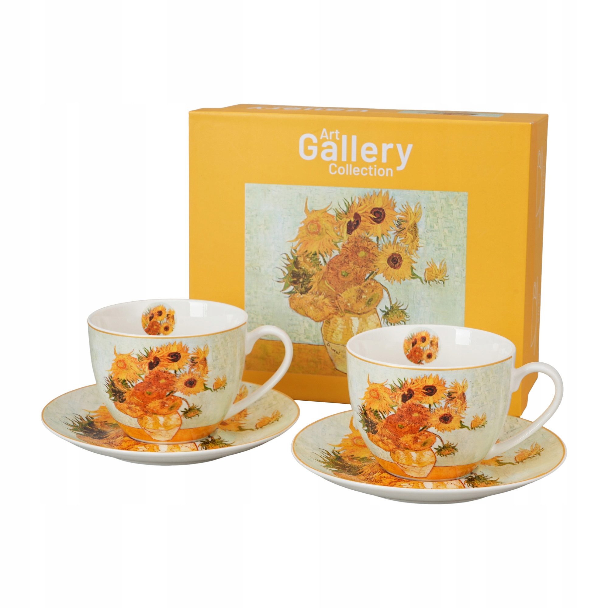 Две чашки и блюдца ПОДСОЛНУХИ, вдохновленные В. Ван Гогом, часть серии Art Gallery, изготовлены из фарфора New Bone China, характеризующегося элегантным и естественным кремово-белым цветом с нежным блеском, а также исключительной прочностью, сохраняя при этом легкость и нежность.