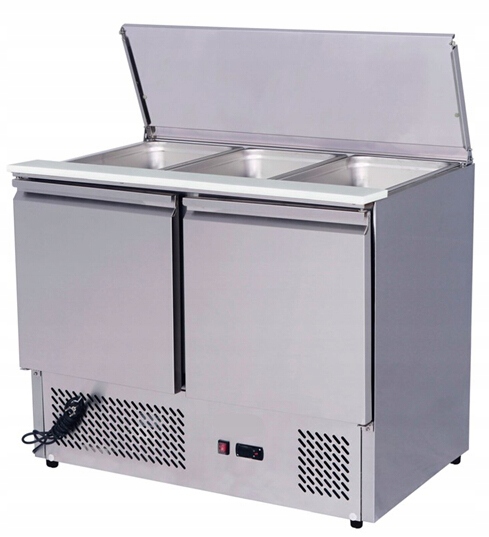 ESL3813 2-дверный холодильный стол для салата с блоком внизу, выполнен из высококачественной нержавеющей стали.