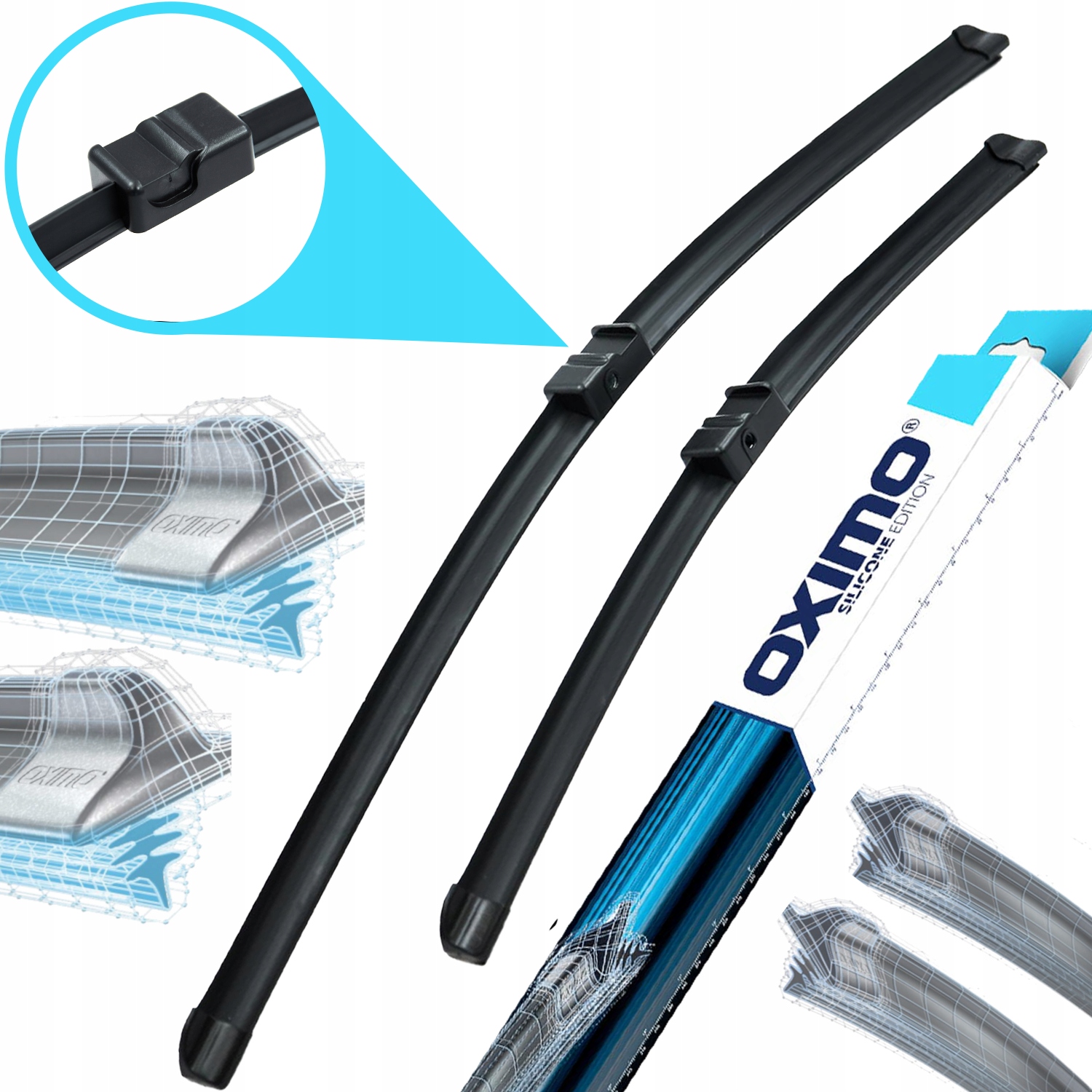 Дворники Oximo характеризуются безрамочной конструкцией и встроенным спойлером.