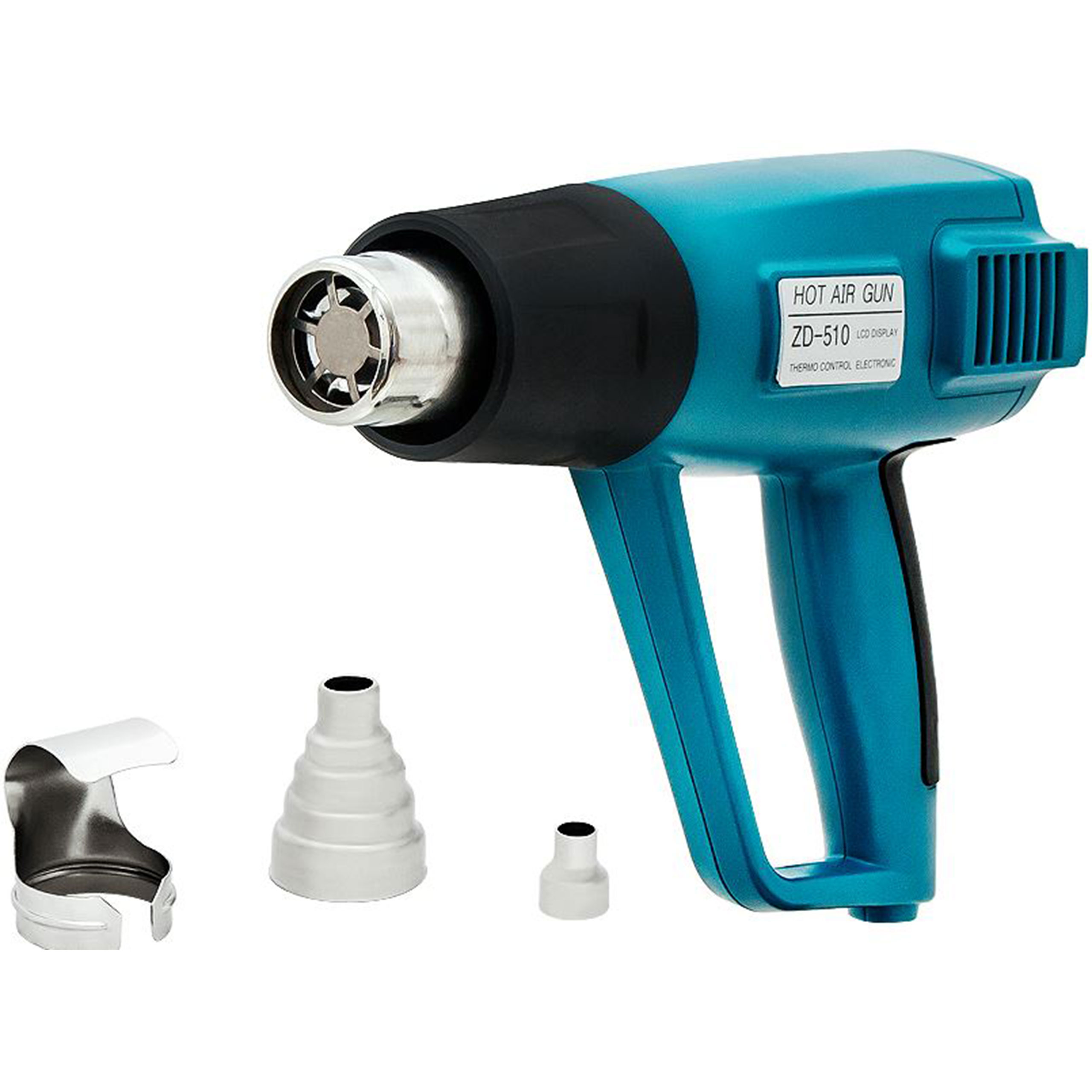 Тепловая пушка ZD-510 имеет два диапазона мощности, позволяющие получать температуры 100-300°С и 300-650°С. Значение температуры можно регулировать двумя кнопками «+»/«-». Каждое нажатие соответствующей кнопки увеличивает или уменьшает температуру на 10°C. Его текущее значение отображается на ЖК-дисплее сзади. В комплект входят 3 разные насадки, которые позволяют регулировать поток горячего воздуха для конкретных задач.