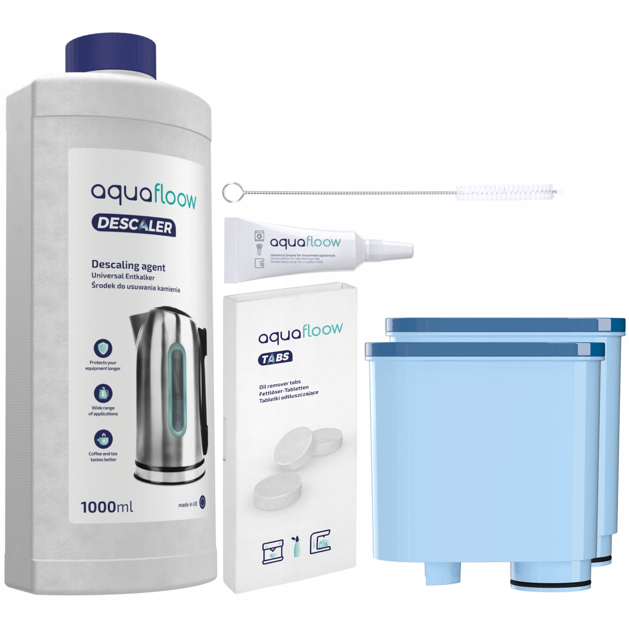 НАБОР AQUAFLOOW ДЛЯ КОФЕМАШИНЫ SAECO / PHILIPS: 2x ФИЛЬТР ДЛЯ ВОДЫ + ОЧИЩАЮЩИЕ ТАБЛЕТКИ + СРЕДСТВО ДЛЯ ОЧИСТКИ НАКИПИ 1 Л + УНИВЕРСАЛЬНОЕ ОЧИСТИТЕЛЬНОЕ СРЕДСТВО/ЩЕТКА + СИЛИКОНОВАЯ СМАЗКА 5 г