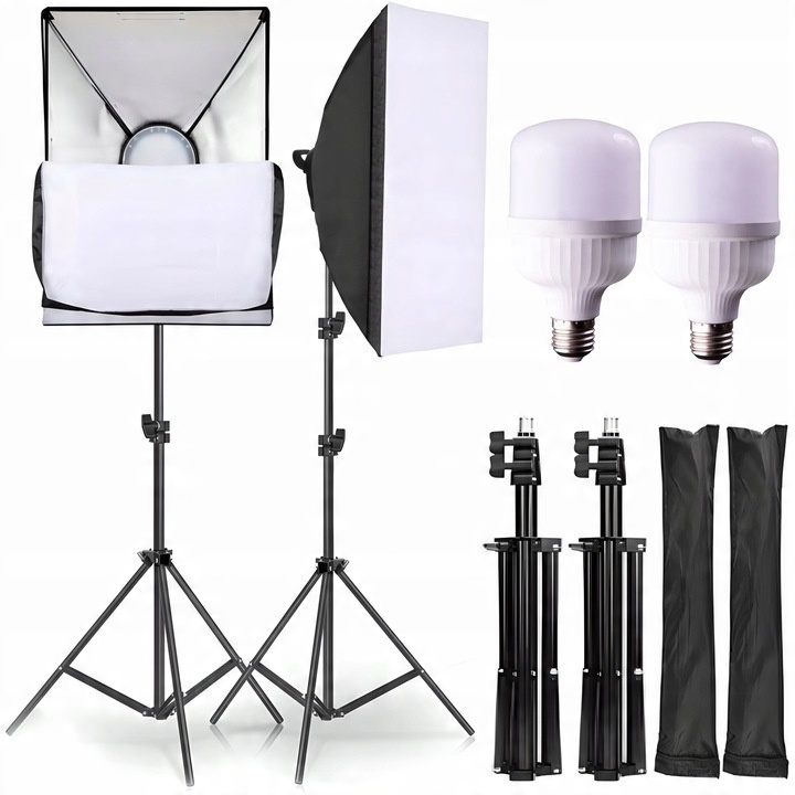 Софтбокс — идеальный продукт для начинающих и профессиональных фотографов. Этот продукт прекрасно смягчает свет и убирает резкие тени, поэтому идеально подходит для предметной фотографии и портретов. В комплект также входят 2 штатива, 2 лампы постоянного света 5500К, 2 рассеивателя и 2 чехла для подставок.