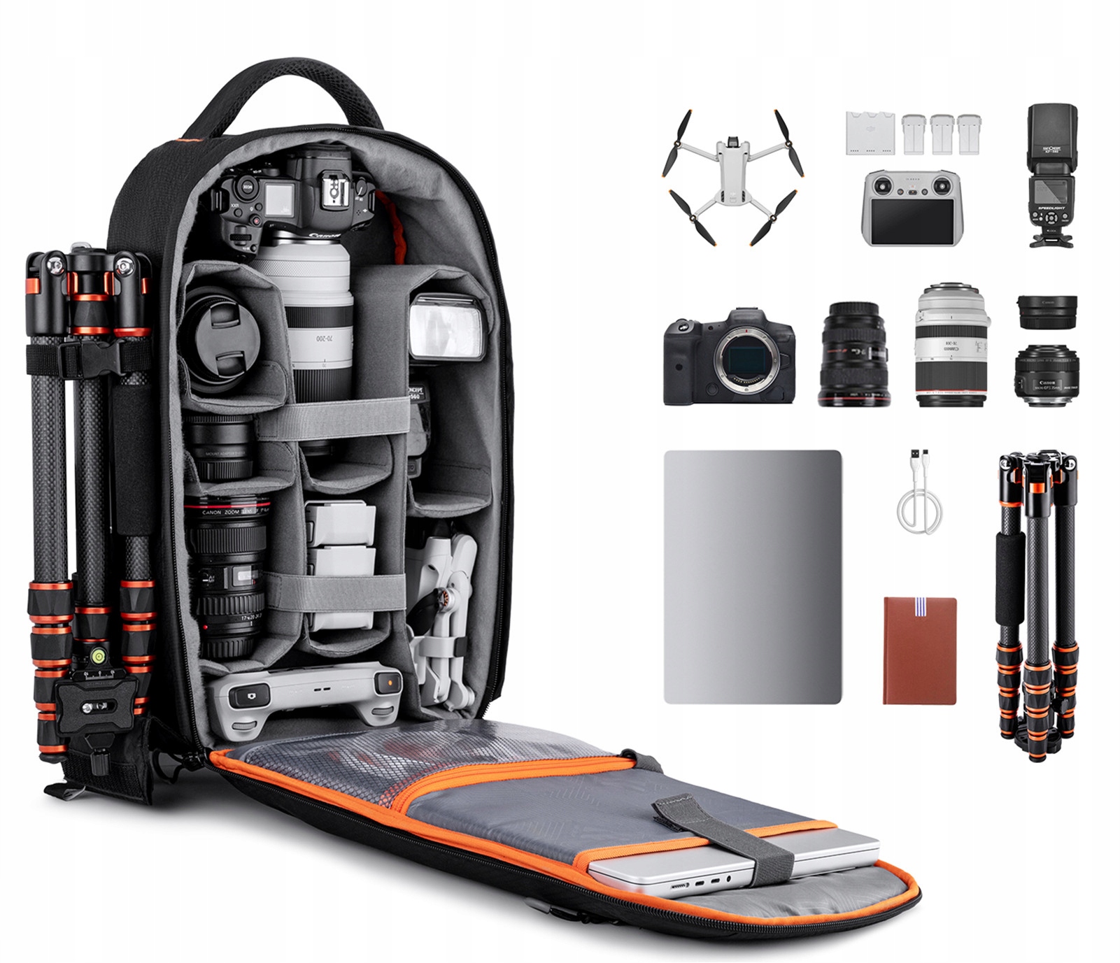 Рюкзак имеет множество дополнительных карманов для хранения различных вещей - кабелей, зарядных устройств, аккумуляторов, фотофильтров, карт памяти и книг, блокнотов, газет и т. д.