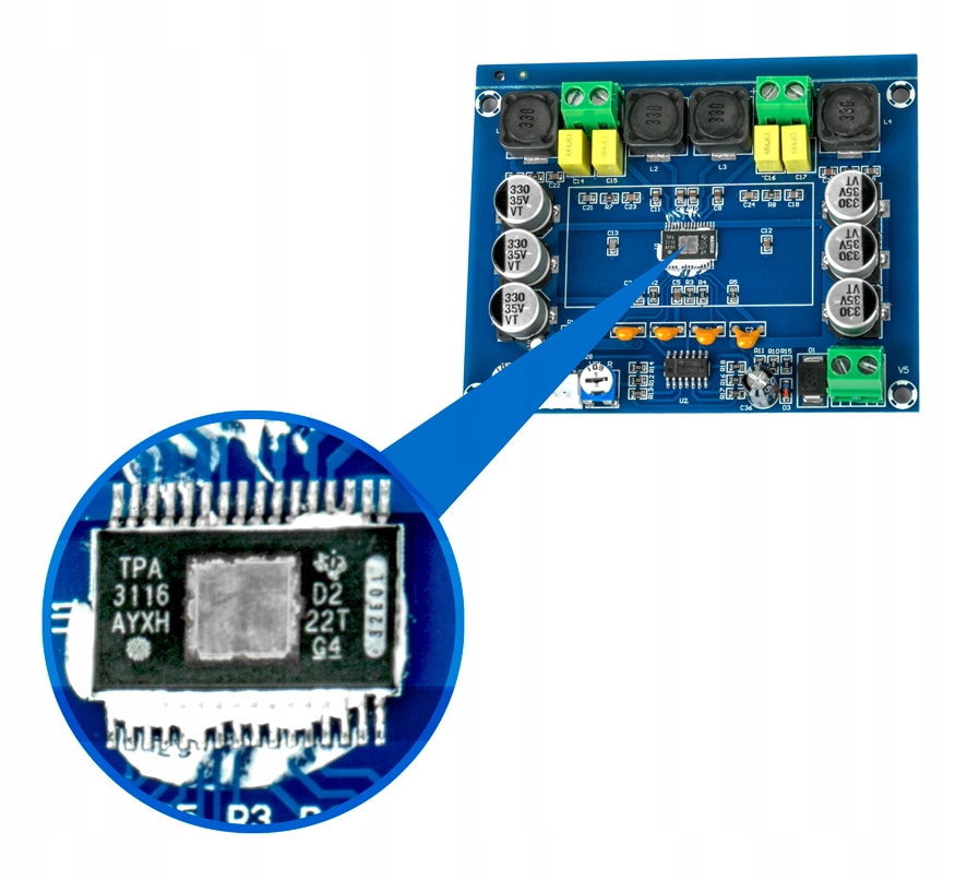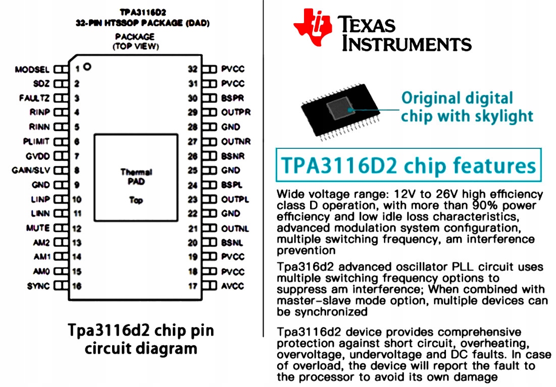 2. Стерео -цифровой усилитель с высокой точки зрения: чип tpa3116d2 -это система цифровой усилители, которая обеспечивает энергоэффективность более 90%, низкая способность потребления энергии и минимальная теплоемкость.