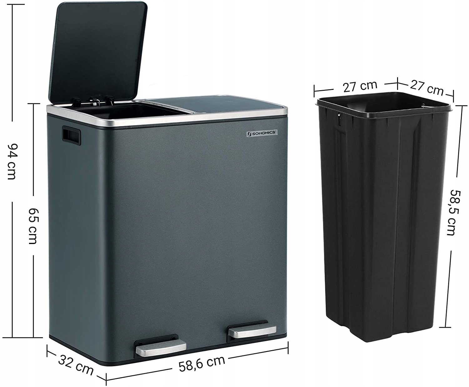 - Размер ведра внутри: 27 x 27 x 58,5 см (Д x В). Ш x В)