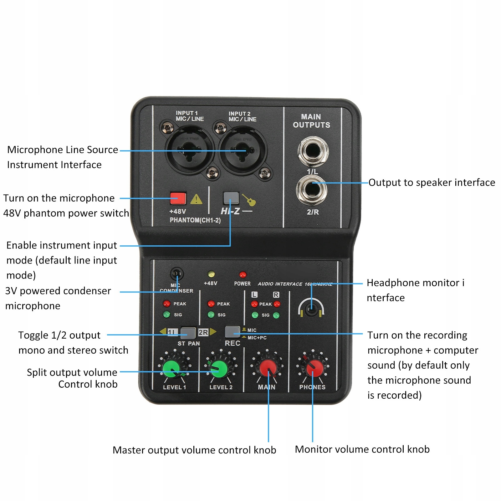 5. Широкое применение: 2-канальный аудиомикшер подходит для различных сценариев, таких как запись музыки, домашнее караоке, интернет-караоке и т. д.
