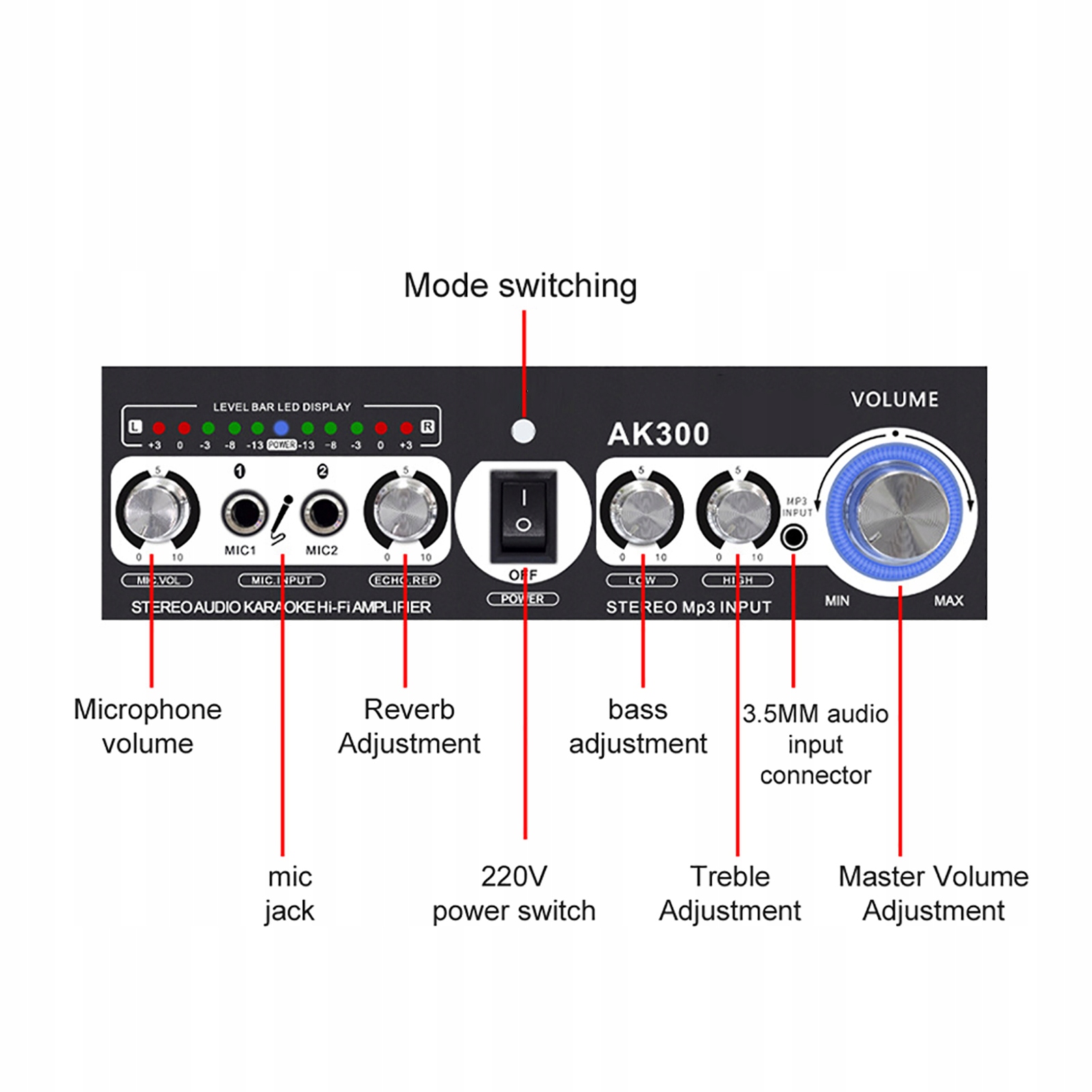 - Усилитель также имеет различные ручки управления для регулировки громкости микрофона, реверберации, высоких частот, низких частот и общей громкости. Он также оснащен разъемами для микрофона и аудиовходом 3,5 мм.