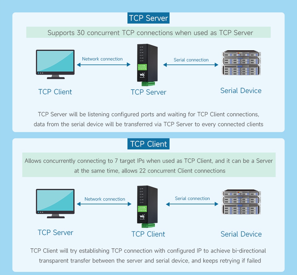 - Режимы работы: TCP-сервер, TCP-клиент (может сосуществовать с TCP-сервером), UDP, многоадресная рассылка UDP.