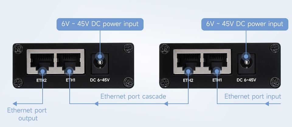 - Поддержка электропитания через терминал постоянного тока 6–45 В или PoE (версия PoE ETH B)