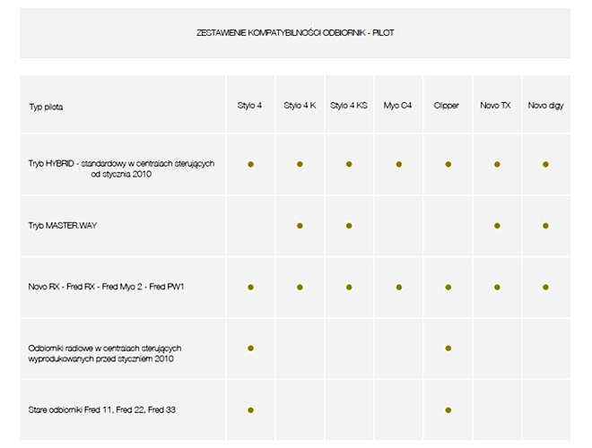 <ул>Примечание. Не путайте пульты дистанционного управления King Gates STYLO 2K и 4K с моделью STYLO 4 с таким же внешним видом корпуса. Пульт дистанционного управления STYLO 4 совместим со всеми радиостанциями King Gates, но не работает в режиме Master.Way. Пульты STYLO 2K и 4K работают в режиме Master.Way, но несовместимы со старыми радиоприемниками (Fred 11, Fred 22, Fred 33, радиоприемниками в блоках управления, выпущенными до января 2010 г.). Ниже представлена таблица совместимости пультов дистанционного управления.