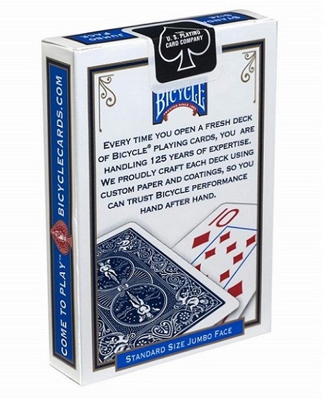 Мы предлагаем двойной набор игральных карт для покера высочайшего качества — дизайн JUMBO Index BICYCLE. Карты производства американской компании U.S. Компания по производству игральных карт. Карты изготовлены из лучших композитов. Тщательная обработка и отличное качество обеспечивают максимальный комфорт во время игры. Именно такая модель индекса JUMBO используется в крупнейших турнирах по покеру и бриджу. В наборе две колоды карт.