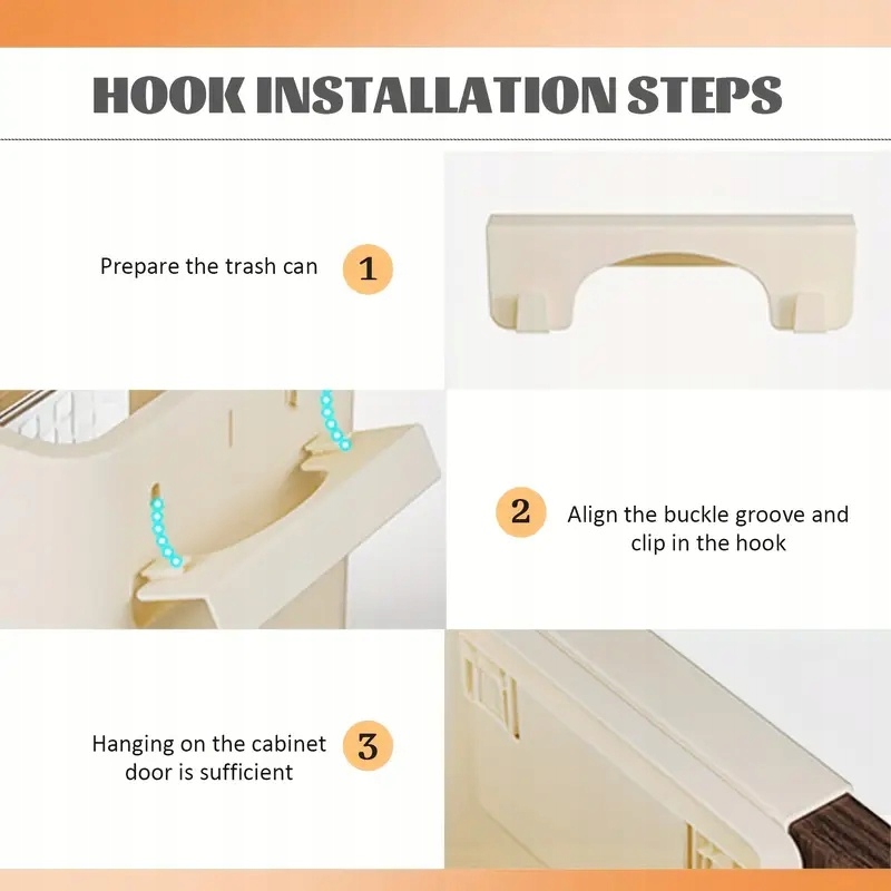 Многофункциональность и простота установки: Корзину для мусора можно легко повесить на дверцы шкафа, ящики и даже шкафы, максимально увеличивая площадь столешницы и пола. Он находится под рукой, позволяя быстро и легко убрать кухонный мусор, экономя время и устраняя неприятные запахи. Контейнер для мусора можно закрепить двумя способами: с помощью крючков или самоклеящихся наклеек. Контейнер для мусора можно отрегулировать под дверцы шкафов разной толщины.