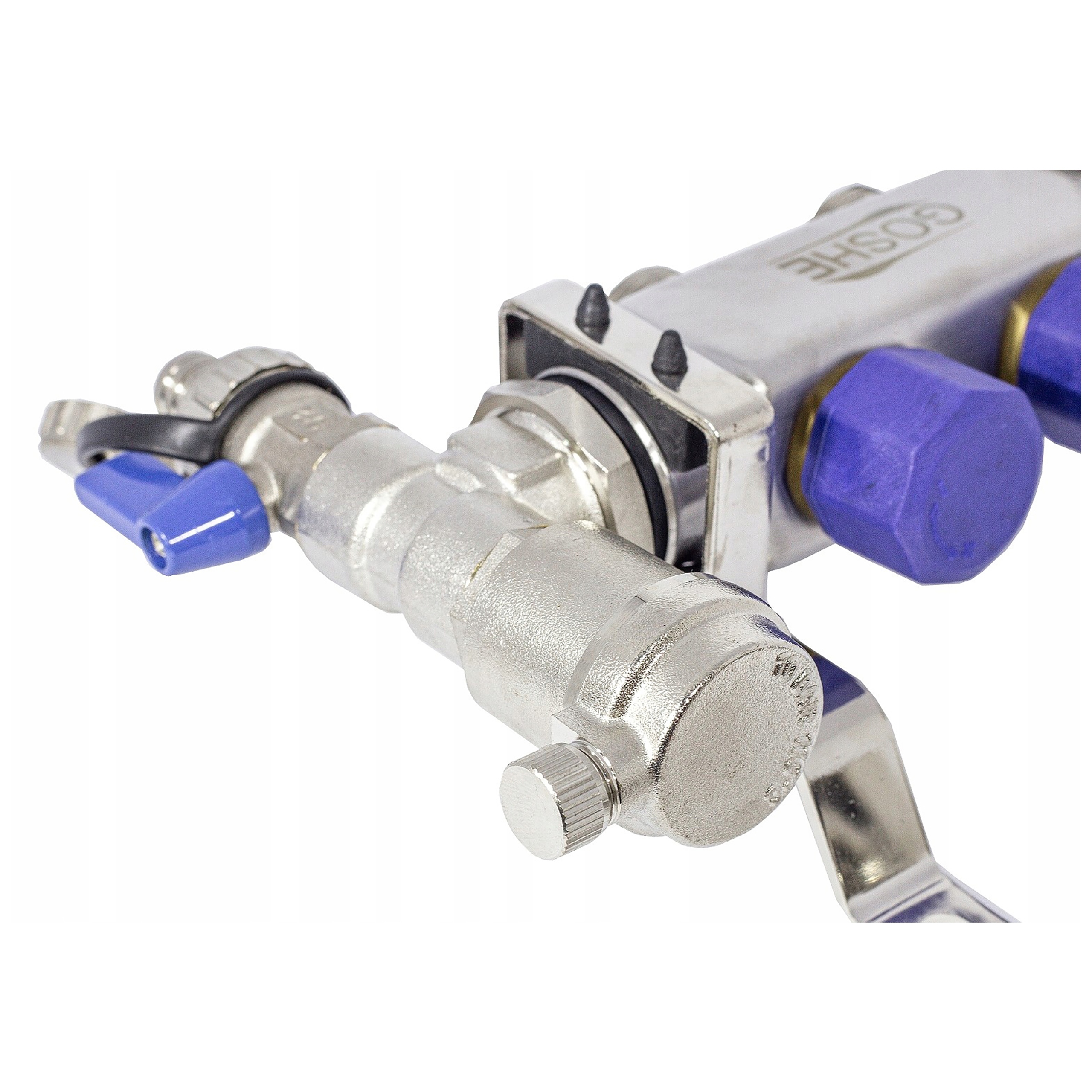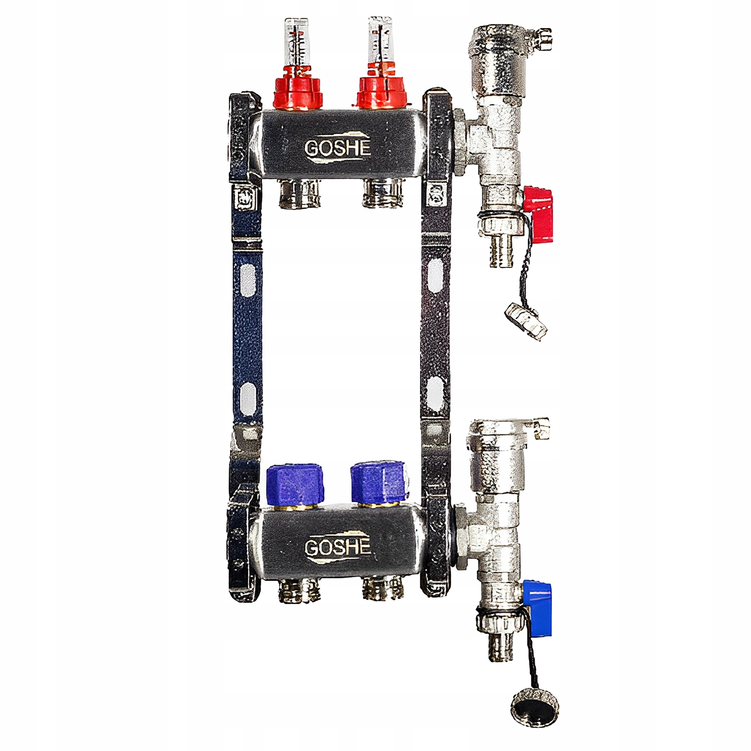 ⏩ Коллектор из нержавеющей стали ГОШЭ 0331.210 (2 контура) - балки никелированные, ротаметры, термостатические вставки для приводы, автоматические и ручные воздухоотводчики, сливные клапаны в комплекте.