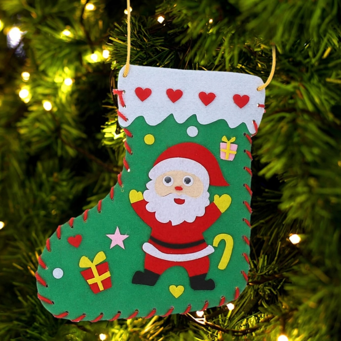 Этот креативный набор для шитья новогодних чулок – отличная идея для подарка, который доставит массу радости и создаст праздничное настроение. В комплект входят два фетровых носка: красный с мотивом елочки и зеленый с мотивом Деда Мороза. В набор входят все элементы, необходимые для изготовления носков: фетровые основы, самоклеящиеся декоративные элементы, швейная нить и безопасные пластиковые иглы. Благодаря этому набору дети и взрослые смогут создать свои уникальные подарочные носки - сначала сшив их, а затем украсив украшениями из фетра.