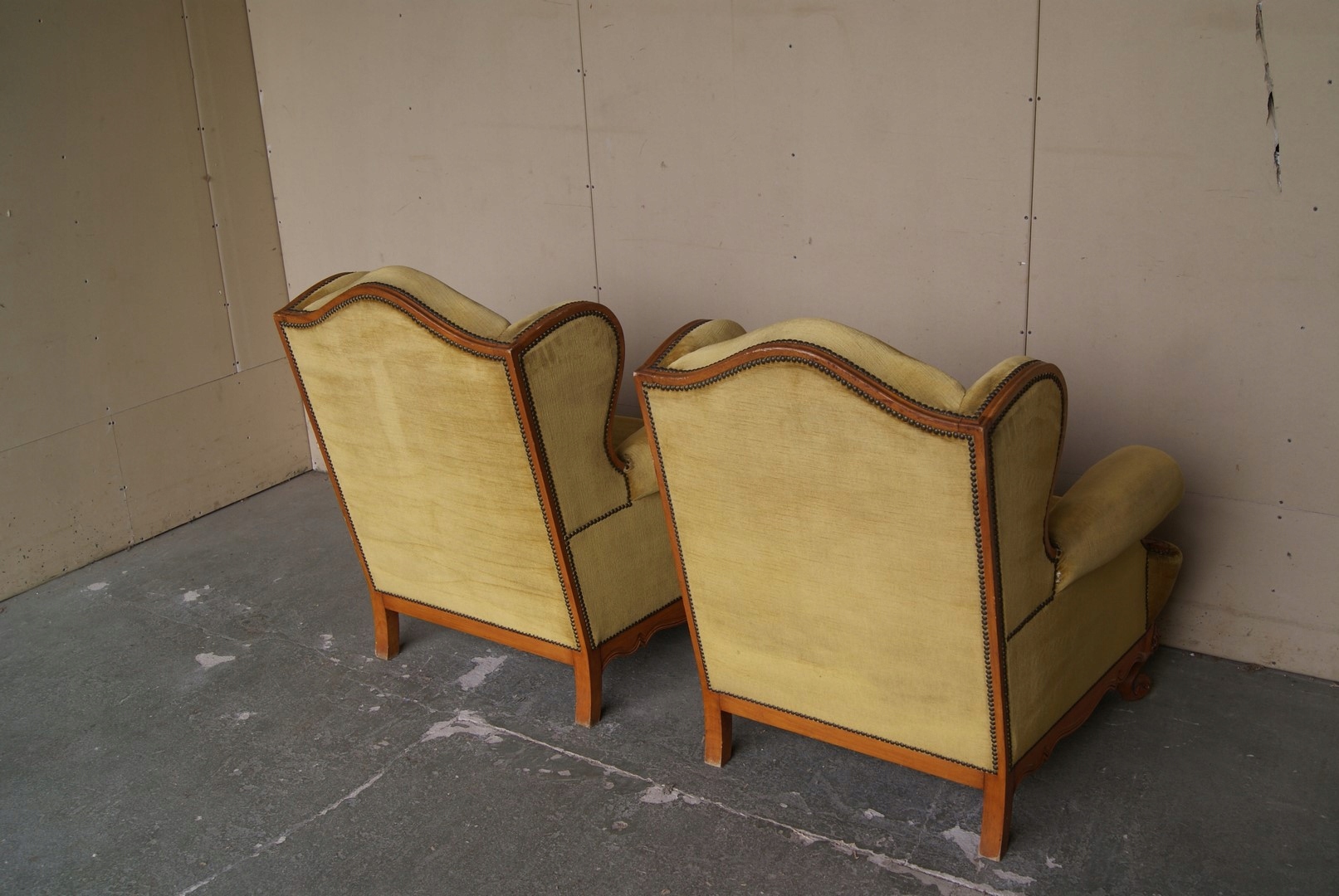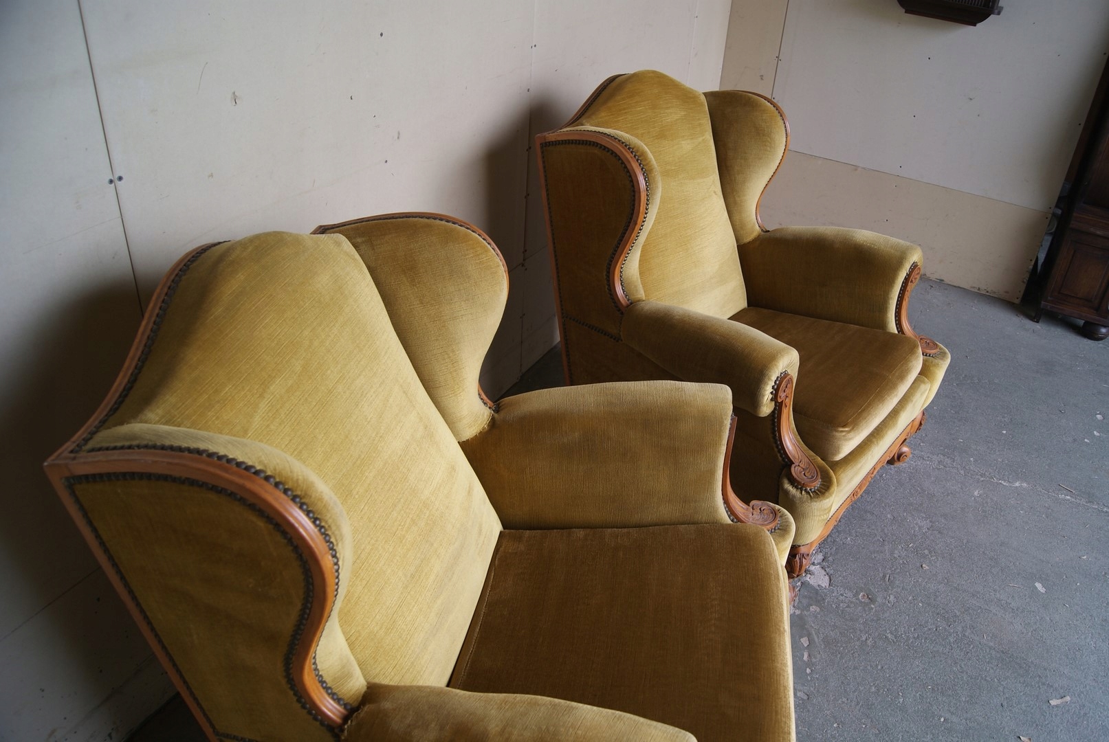 Состояние кресел видно на фотографиях, конструкция устойчивая. Рваный материал возле поручней сзади - сиденья надо перетягивать. Цвет медовый.