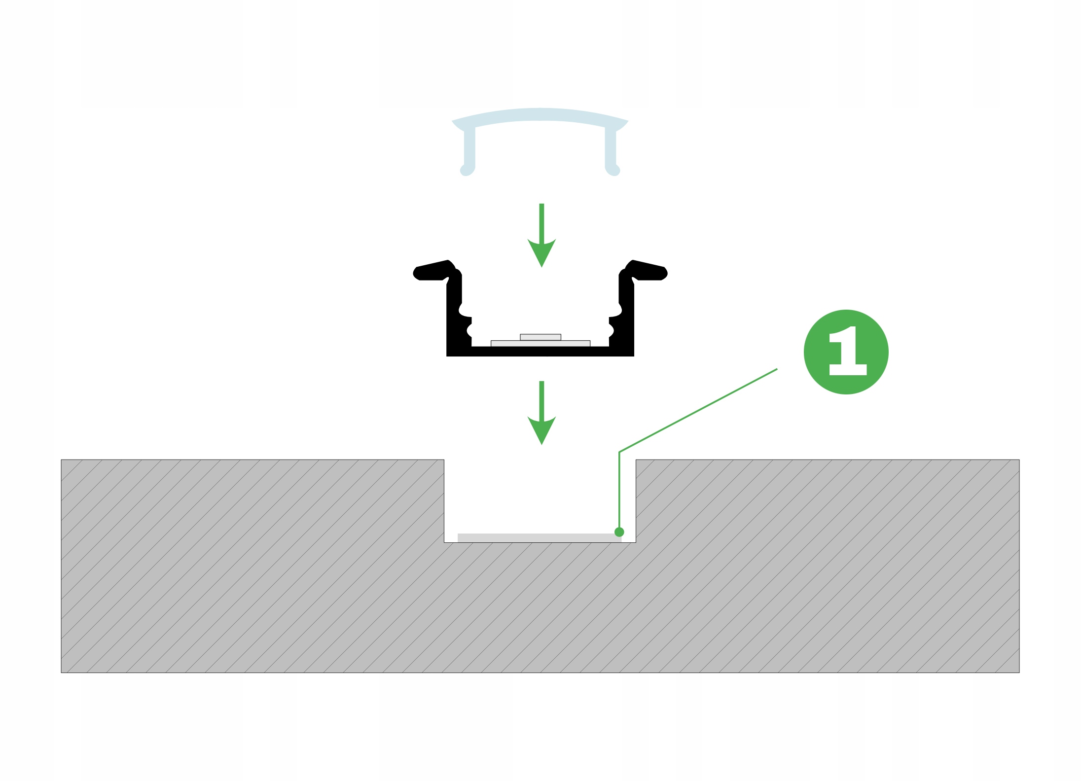 Профиль приспособлен для вставки в отверстие, профрезерованное на поверхности. Профиль можно прикрепить к предварительно выфрезерованному отверстию нажимом, с помощью монтажного клея или скотча (1).