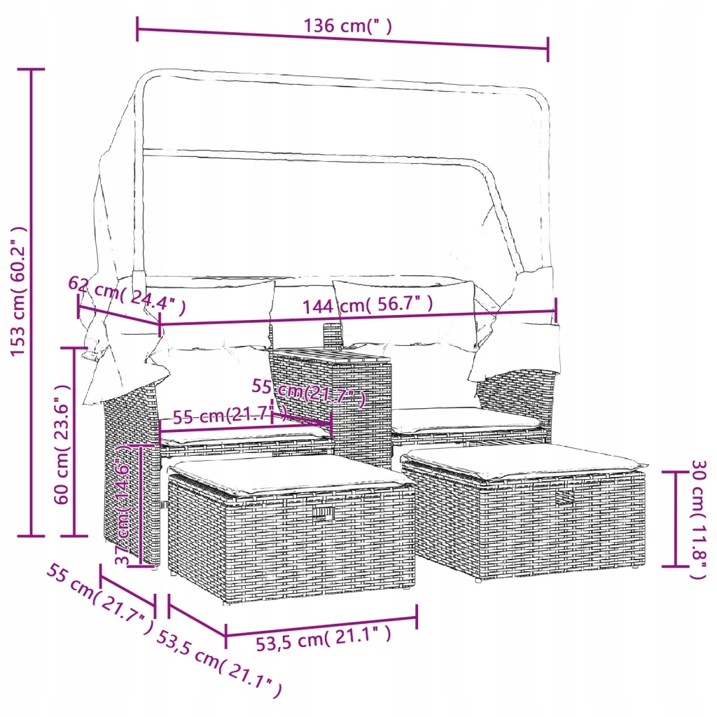 2-місний садовий диван з балдахіном і табуретами, бежевий, ПЕ ротанг