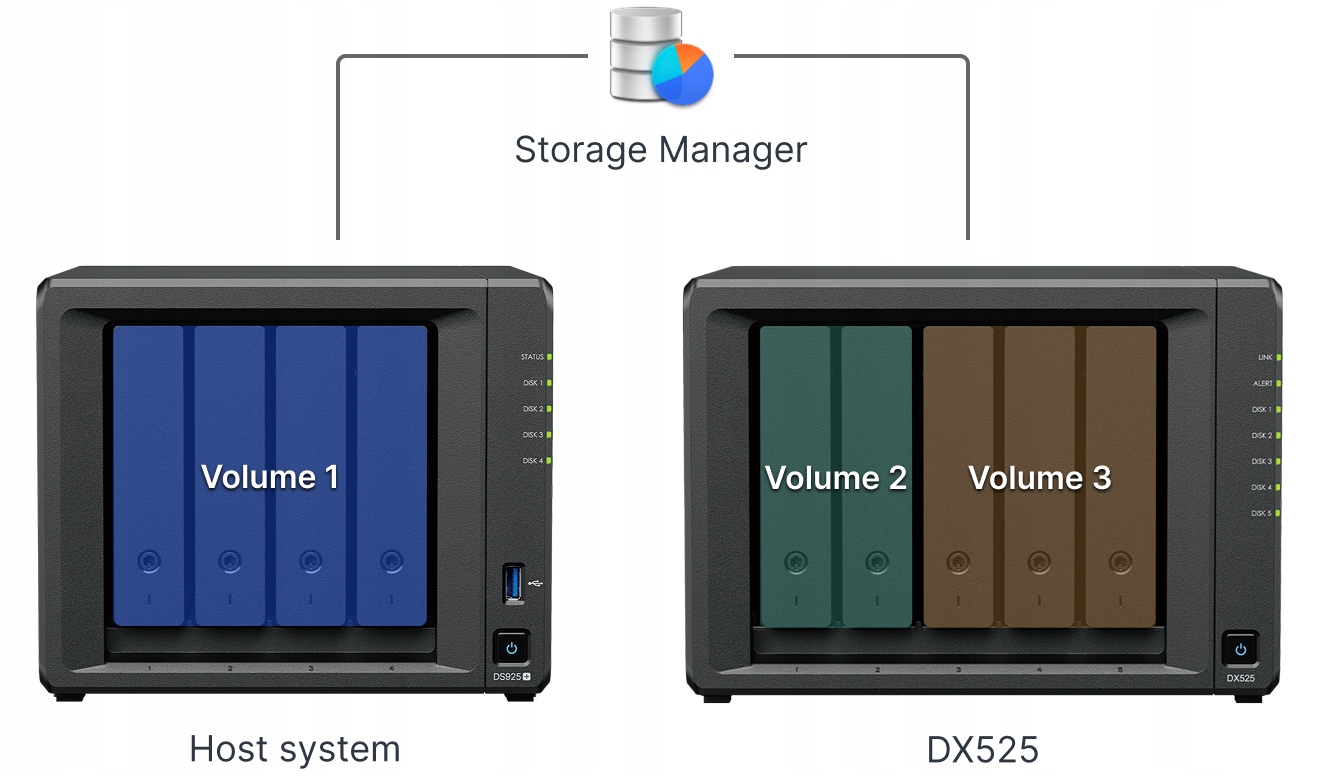 Управляемые DiskStation Manager (DSM) хоста NAS, дополнительные отсеки DX525 становятся доступными сразу после подключения. Расширение тома «на лету» обеспечивает бесперебойное обслуживание и расширение памяти на хосте.