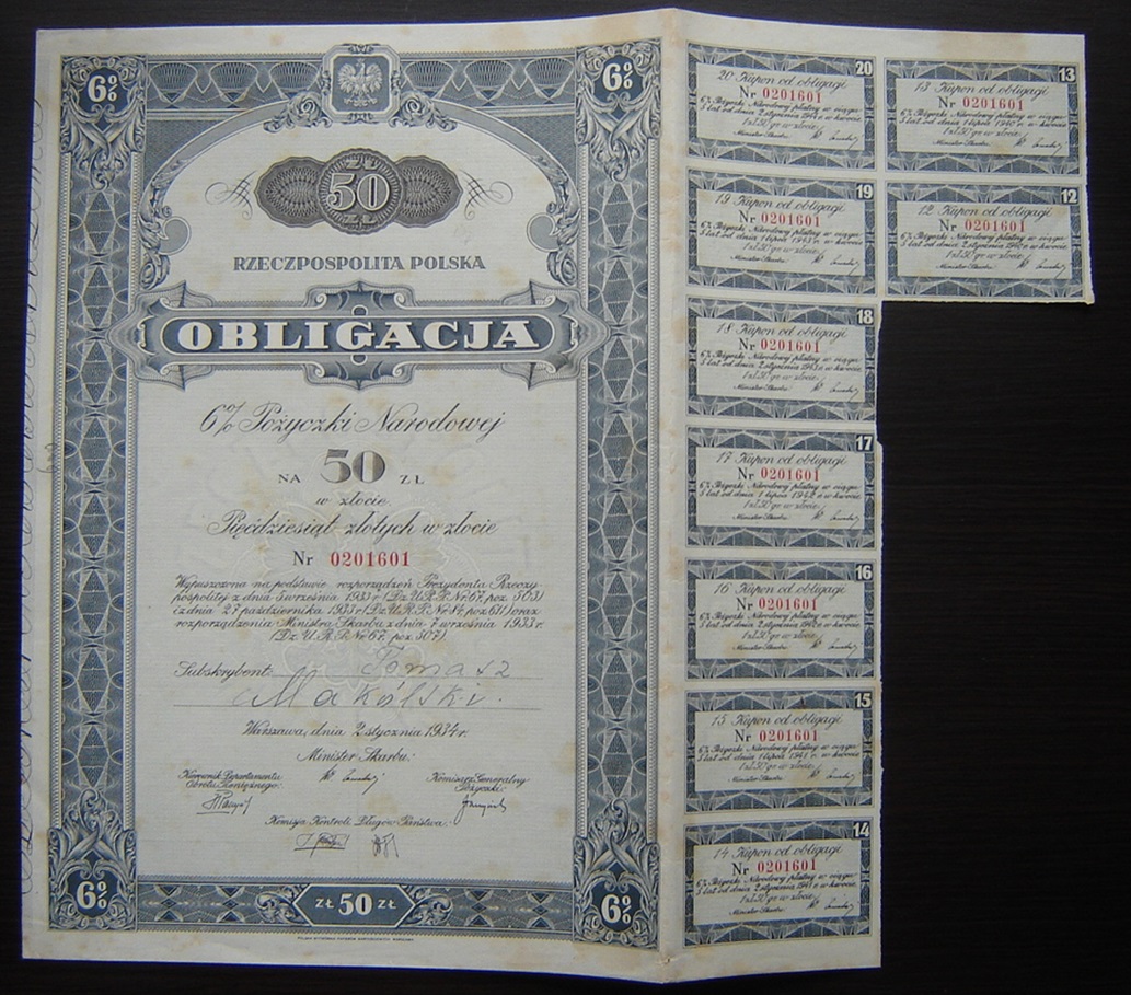 2 ОБЛІГАЦІЇ 6% ПО 50 ЗЛ. І 100 ЗЛ. ЗОЛОТОМ 1934 р.