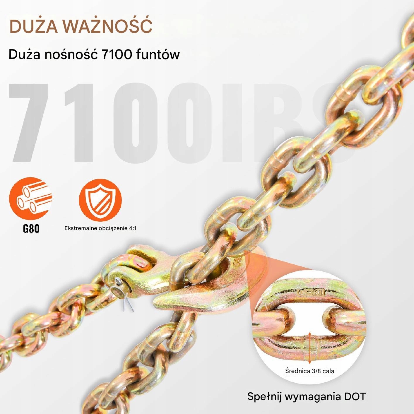 Цепь изготовлена из марганцевой стали G80, отвечающего требованиям. Закрытие цепи VEVOR с видимой маркировкой класса "G = 80"