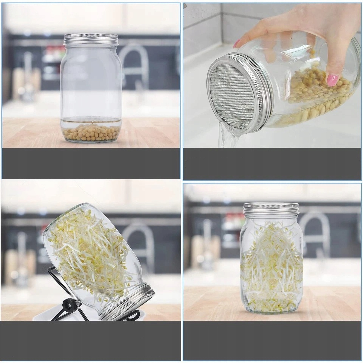 【Подробная информация о проекте】 Наши подносы достаточно глубоки для сбора проточной воды и предотвращения затопления столешницы. Стальная подставка обеспечивает стабильность банок масона, и контейнеры с высокой прозрачной прорастанием позволяют наблюдать за прорастанием.