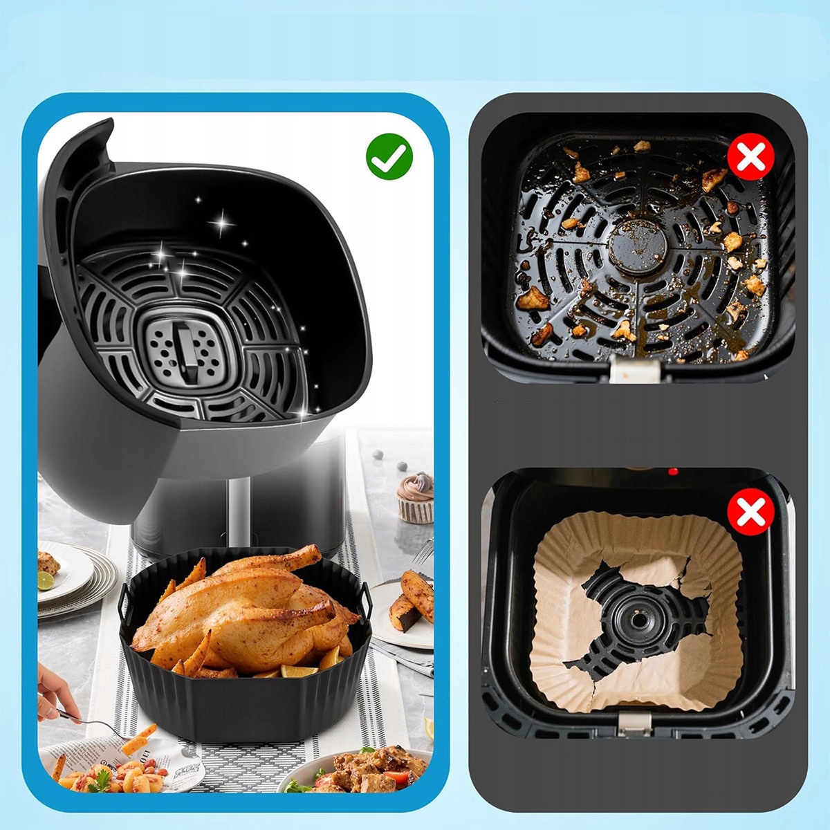 - силиконовая форма для 2 в 1 воздушного фритюрнина, две отдельные камеры для подготовки двух небольших порций одновременно, предотвращая смешивание ароматов и экономия времени и усилий. Один -силиконовая форма может быть использована для приготовления больших порций, таких как вся курица.