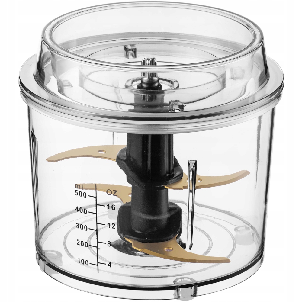 В комплект входит прочный пластиковый контейнер, в который вы измельчаете подготовленные ингредиенты. На внешней части корпуса имеется прозрачный мерный стакан, который позволяет быстро проверить, нарезали ли вы уже нужное количество овощей, орехов и т. д. Также в контейнере можно удобно смешивать ингредиенты или измельчать мясо.