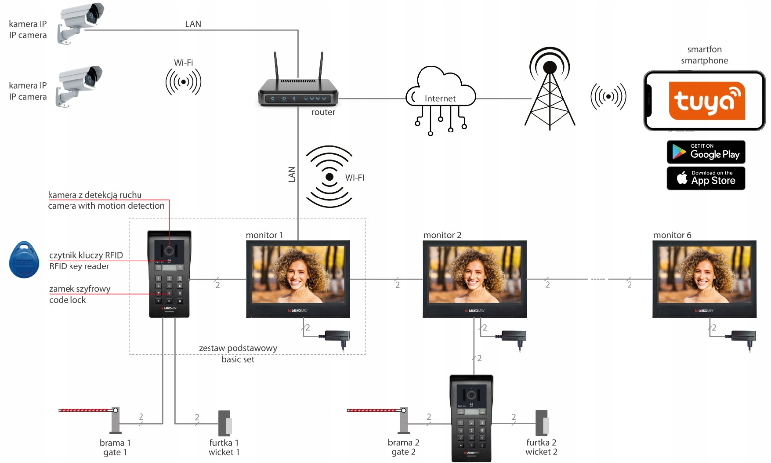 • Сотрудничество с приложением TUYA. Приложение позволяет, среди прочего, получать вызовы на мобильном устройстве, управлять блокировкой ворот, просмотра изображения с камер, просматривая записи.