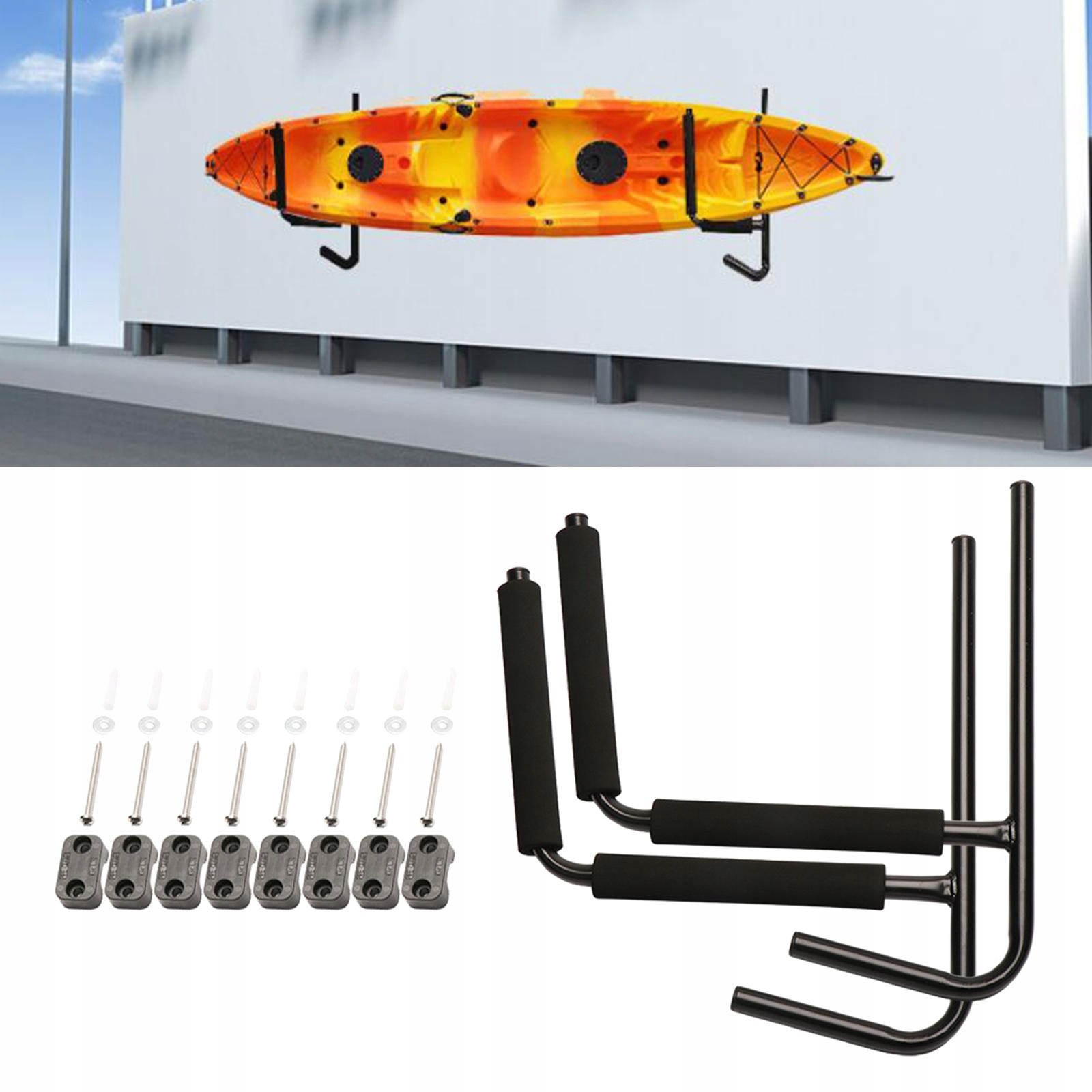 имеет крючки для хранения весов, шлемов и других аксессуаров. Просто установите каяк на стене, когда он вам не нужен, чтобы хранить его внутри и снаружи.