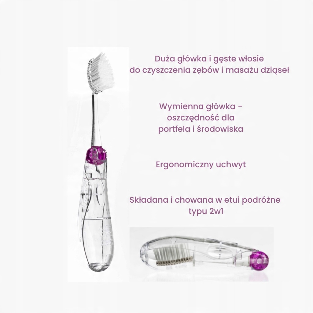 Дорожная зубная щетка Tour™, складная и спрятанная во встроенном футляре. Никаких компромиссов – чистота вам гарантирована, где бы вы ни находились – полноразмерная, обеспечивающая комплексную гигиену полости рта, защиту эмали и массаж десен. Изготовлен из растительного сырья. Прозрачная, с разноцветными вставками.