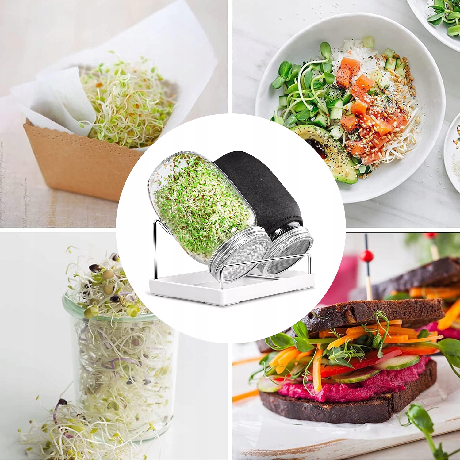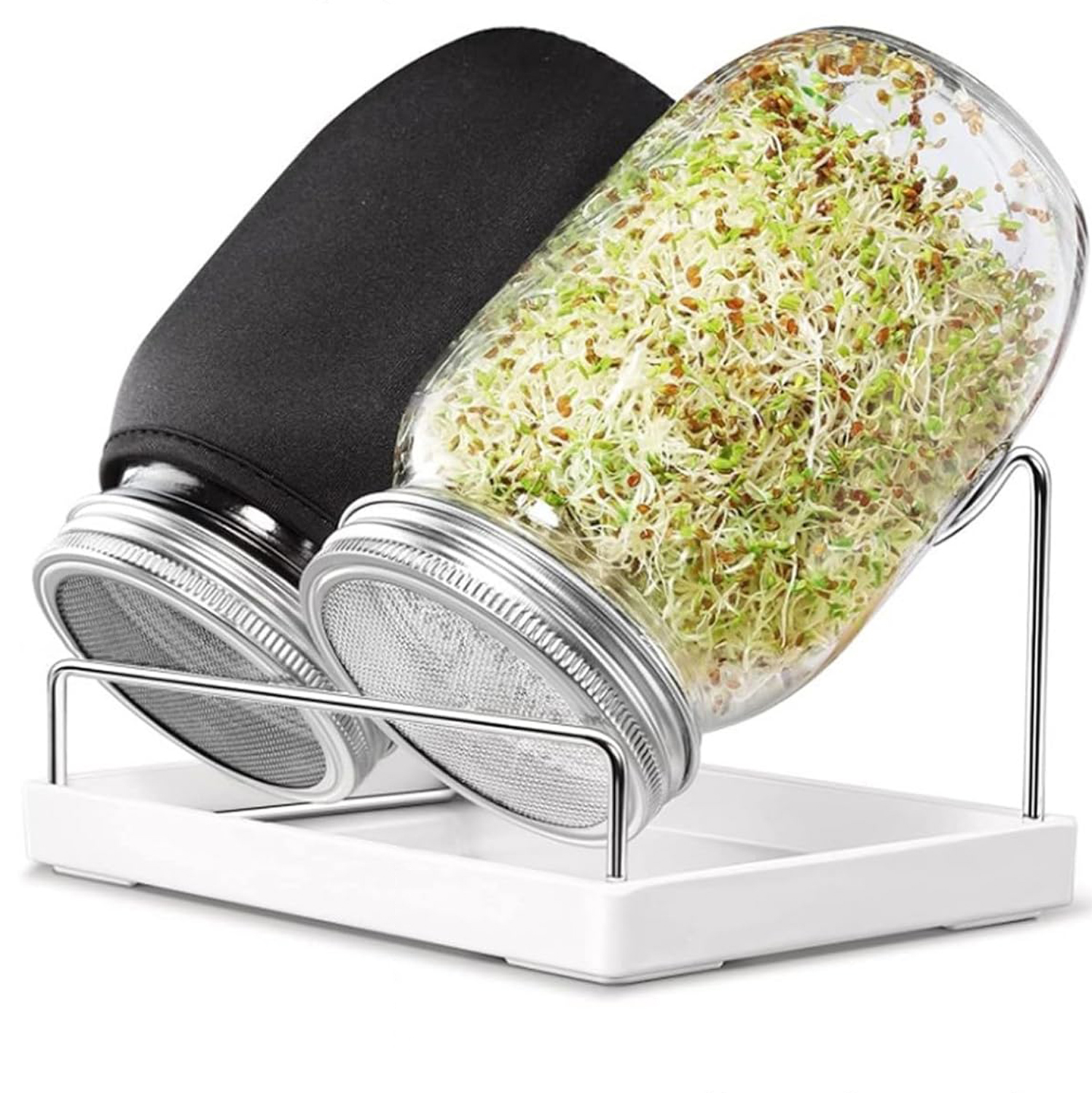 Банка для проращивания В набор банок для проращивания входят все аксессуары, необходимые для выращивания ростков дома. В комплект входят: 2 тканевые крышки, 2 стеклянные банки, 2 крышки из нержавеющей стали для облегчения проращивания, 1 противень, 1 подставка (семена в комплект не входят).