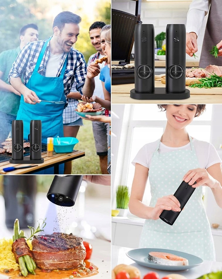 ⭐ Электричество соли и измельчителя перца: соль и перцем из основания с основанием, перцем имеет максимальную емкость 70 мл, вы можете измельчить специи по мере необходимости. Набор включает в себя две шлифовальные средства и основу, которую можно легко хранить, когда они не используются.