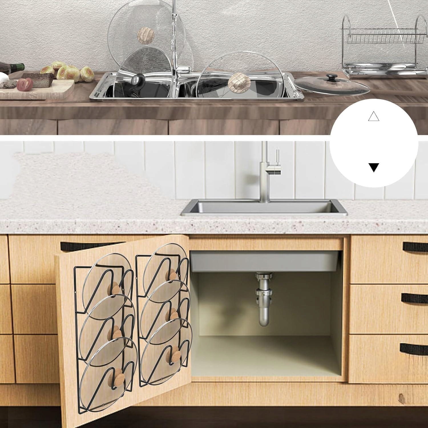 Держатель для крышек из двух упаковок с 6-уровневой вместимостью поможет вам организовать беспорядок на кухонных столешницах и крышках кастрюль, на которых больше нет места. Его можно разместить где угодно, например над раковиной, рядом с плитой или на рабочей поверхности, стенах, дверцах шкафа и т. д. для экономии места.