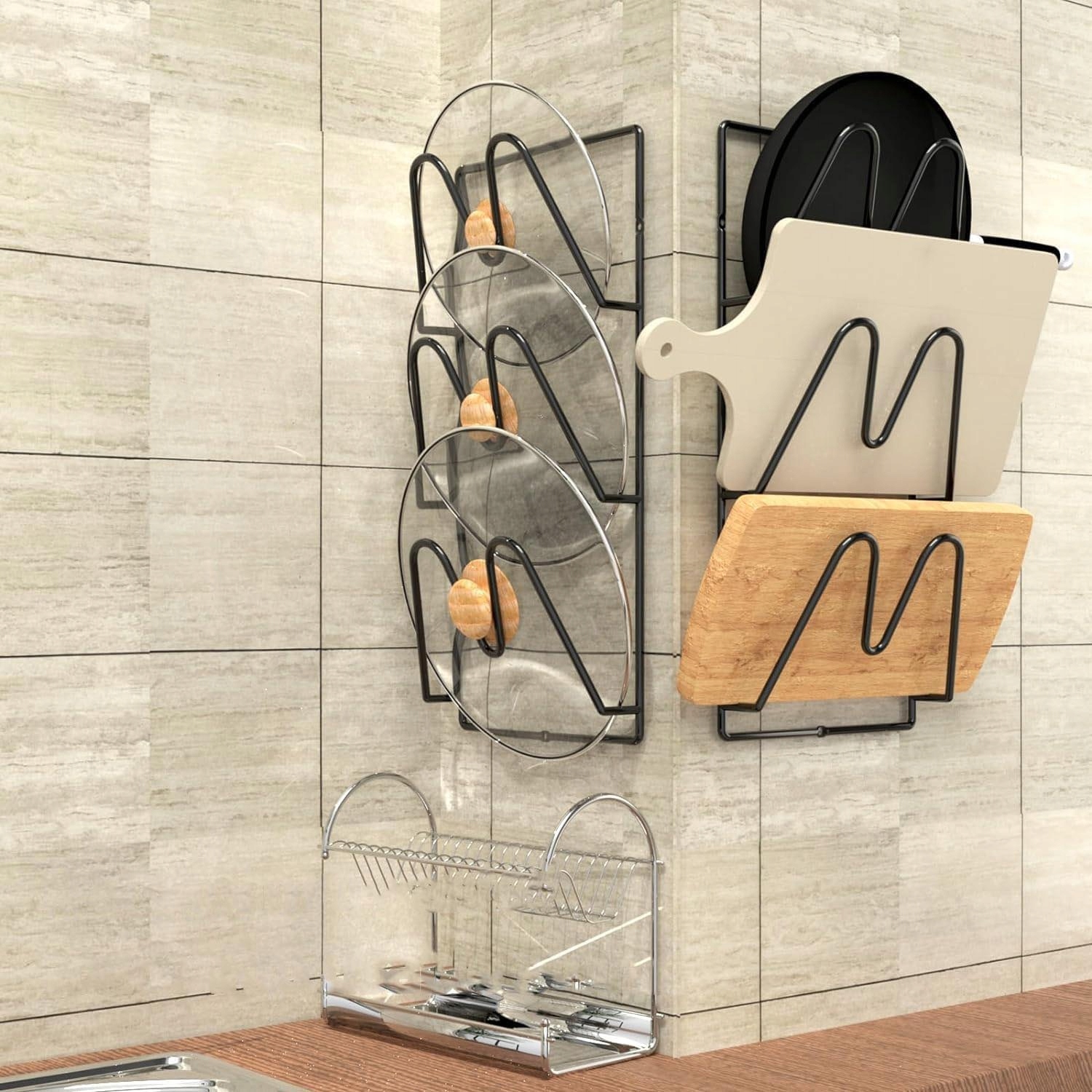 Подставка для кастрюли проста в установке, и на выбор есть два метода установки: винты или самоклеящиеся крючки. Каждая опора крышки поставляется с 3 винтами и 2 липкими крючками. С помощью шурупов полку можно надежно прикрепить к различным неровным стенам, а с помощью клейких крючков полку можно прикрепить, не повредив стену или к гладким дверцам шкафа.