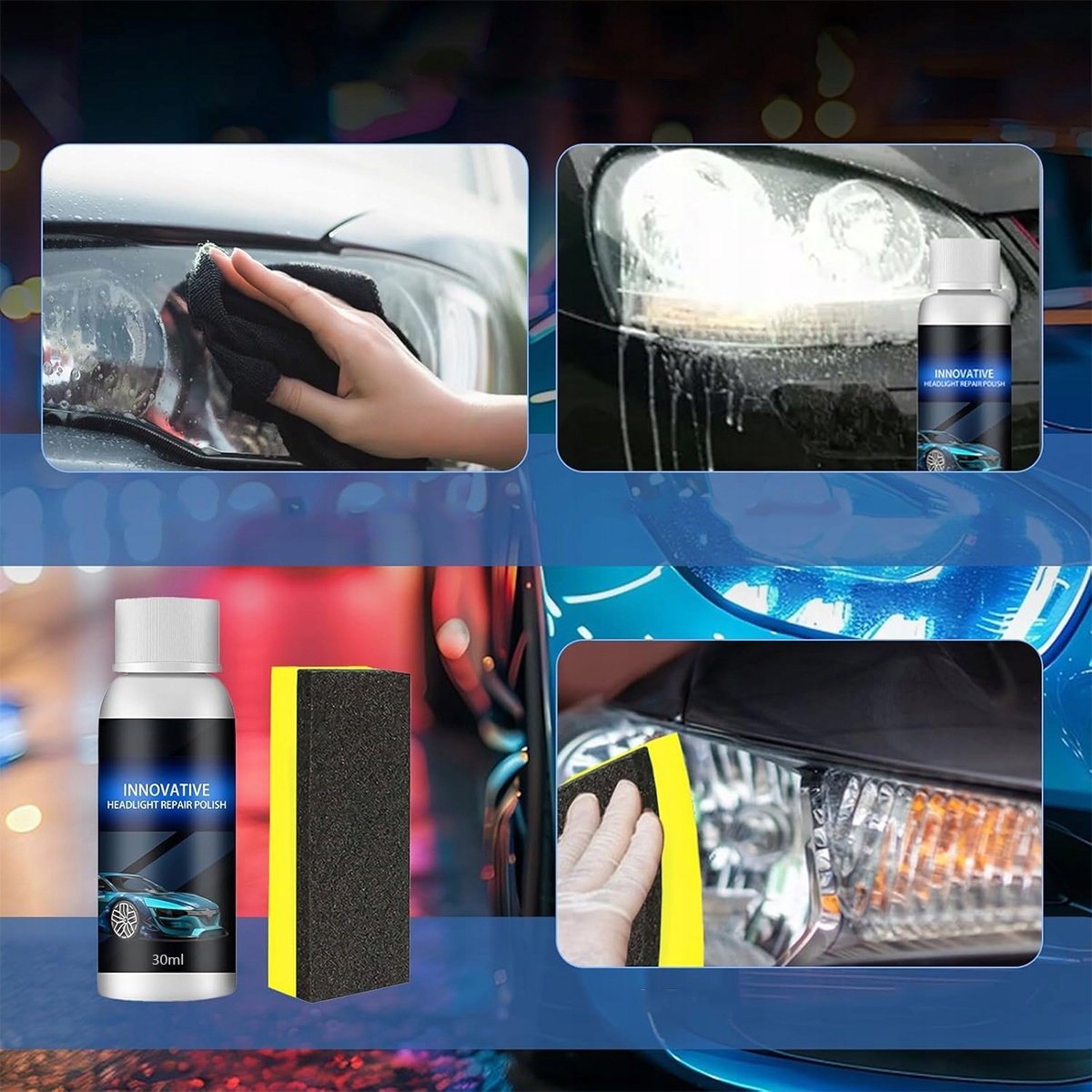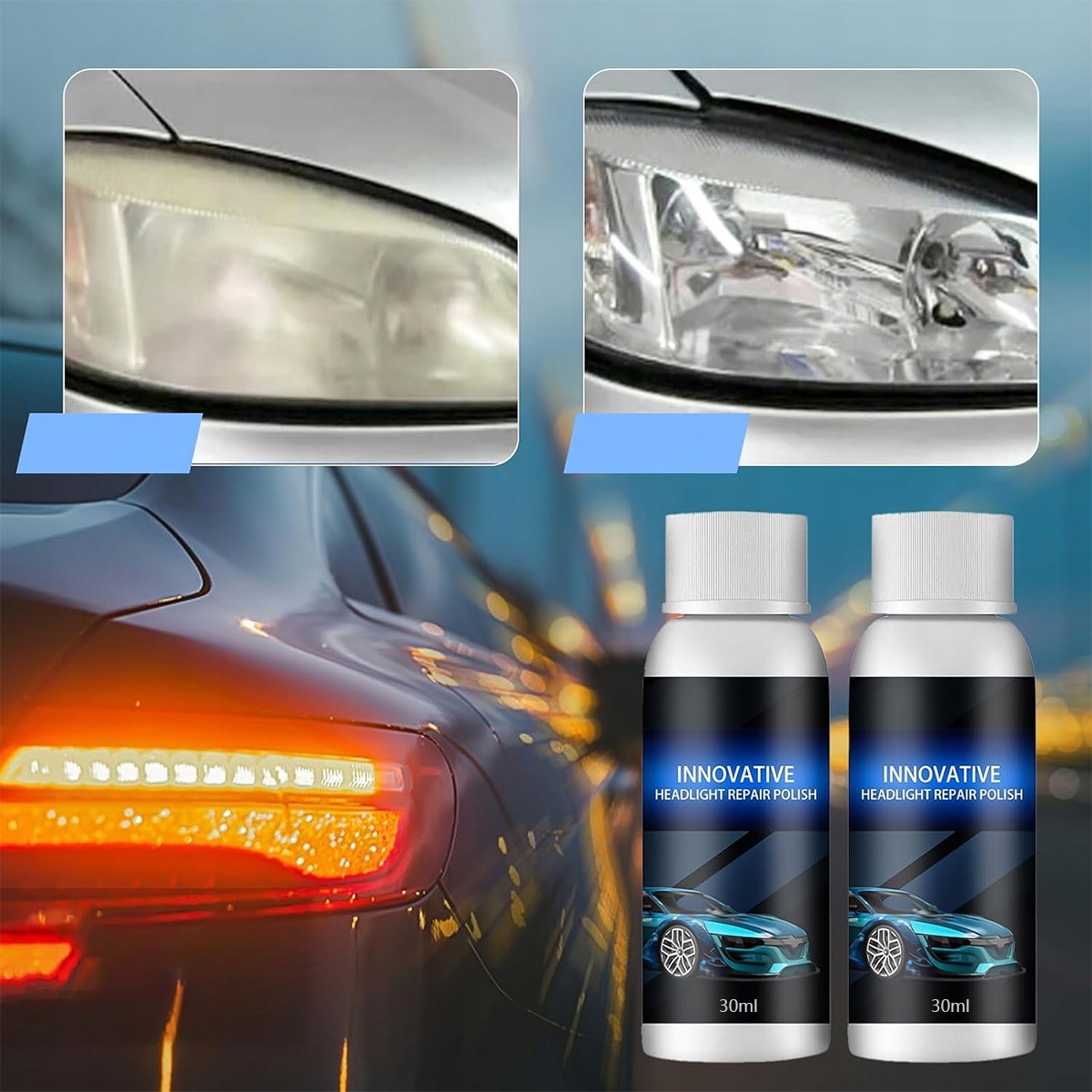 Наша жидкость для ремонта автомобильных фар — это профессиональный продукт, который удаляет мутный желтый туман с линз автомобильных фар и улучшает яркость, освещенность и видимость ваших фар для более безопасного вождения в ночное время.