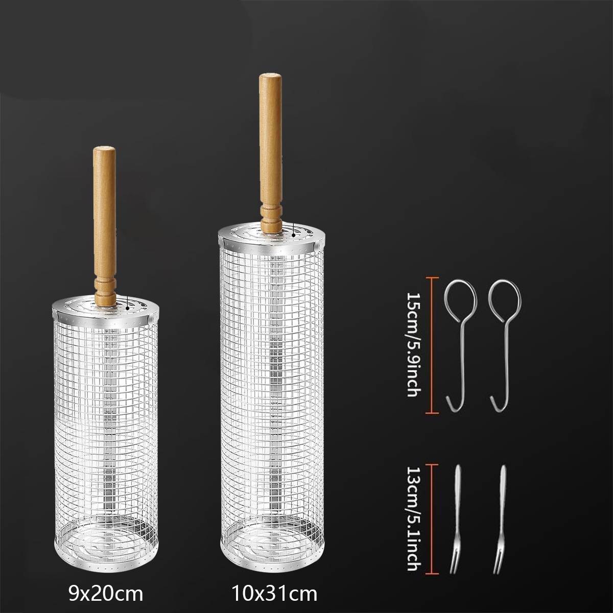 - 2- частичный комплект: большая Φ10см*В31см + маленькая Φ9см*В20см набор корзин для гриля с 2 деревянными ручками + 2 вилками из нержавеющей стали (для опрокидывания) + 2 крючками из нержавеющей стали (для подъема). Экономьте время благодаря большой емкости, которая идеально готовит овощи. Он также портативен, что упрощает его хранение. Наслаждайтесь идеально приготовленными на гриле овощами с меньшими усилиями.