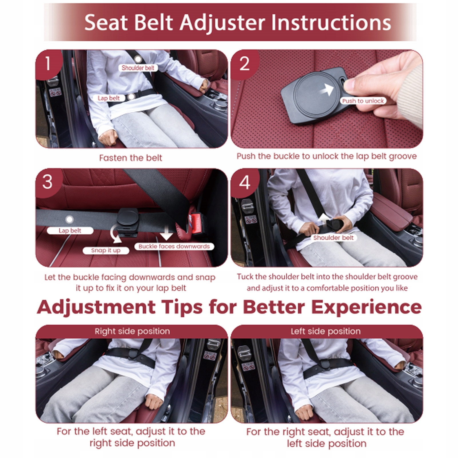 1. Мощная функция: Улучшенные регуляторы ремней безопасности предназначены для перемещения ремня безопасности от шеи и лица, уменьшения трения и увеличения комфорта без повреждения безопасности. Новая версия безопаснее и менее восприимчива к скольжению.