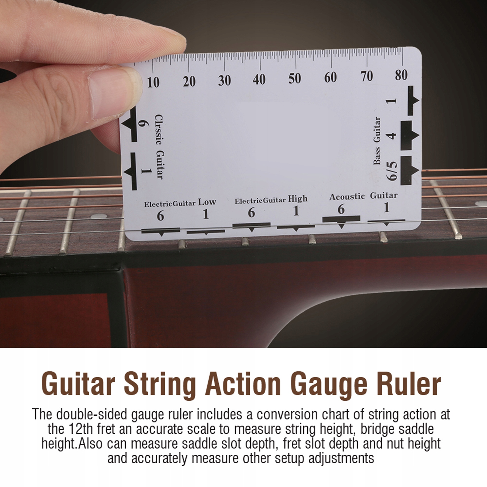 1 、 Правитель с двойным счетчиком содержит диаграмму преобразования струнных акций при 12 пороговых значениях. Точная масштаба для измерения высоты струн, высоты седла соду.