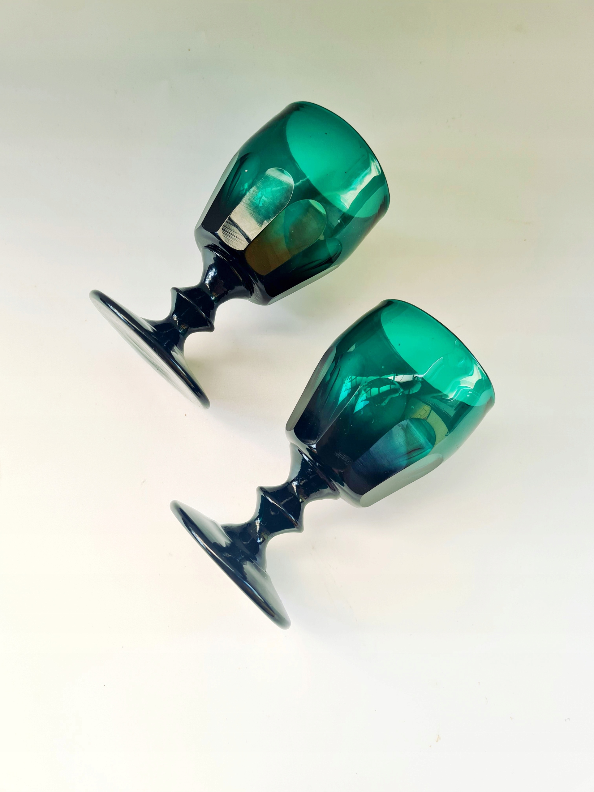 Два изумрудных бокала на красивой ножке и полированной вершине. Точная работа в необычном цвете. Емкость 100 мл. Происхождение: предположительно Англия, предметы довоенной эпохи (возможно, даже середина 19 века)