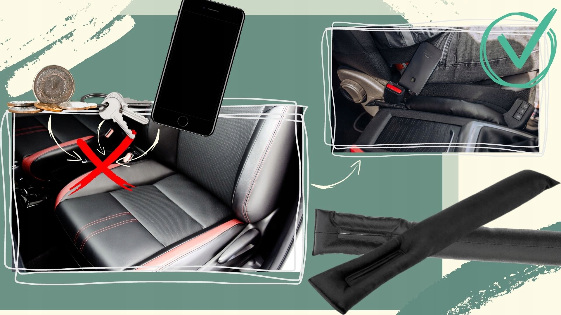 - ✅ Вы устали тянуться за телефоном, ключами или деньгами, упавшими в щель между сиденьем и консолью? Заполнитель зазоров сиденья именно для вас!