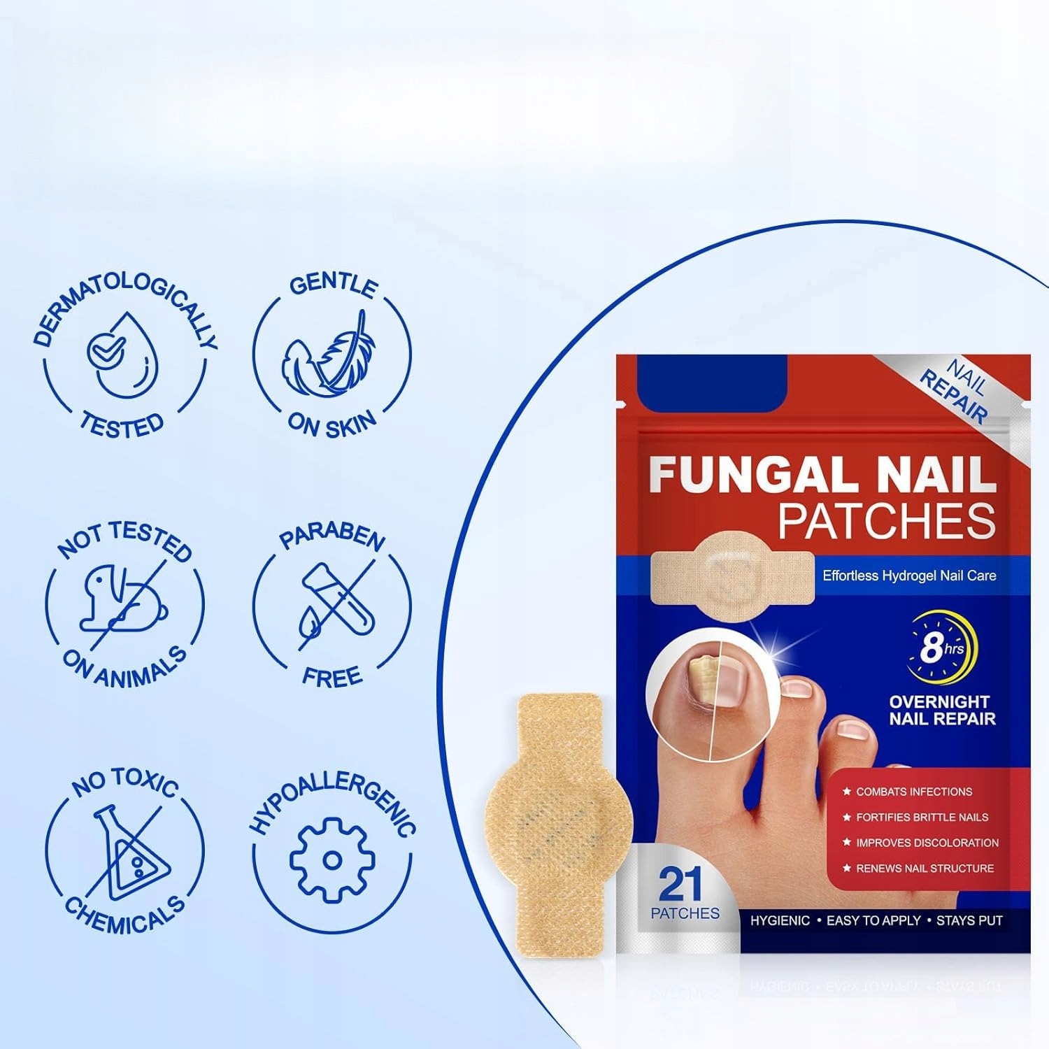 - ✨【Подходит для любой кожи】----- 21 гидрогелевые патчи для ночного восстановления ногтей на ногах. Наши патчи для ногтей можно использовать на всех типах кожи, а эту процедуру для ног можно использовать на ногах и руках. Лечение ногтей возвращает здоровый вид обесцвеченным или поврежденным ногтям.