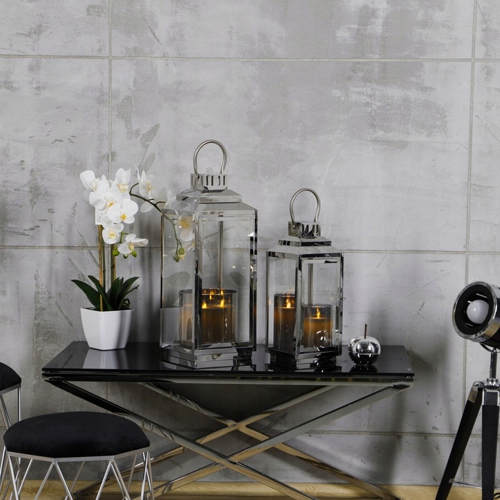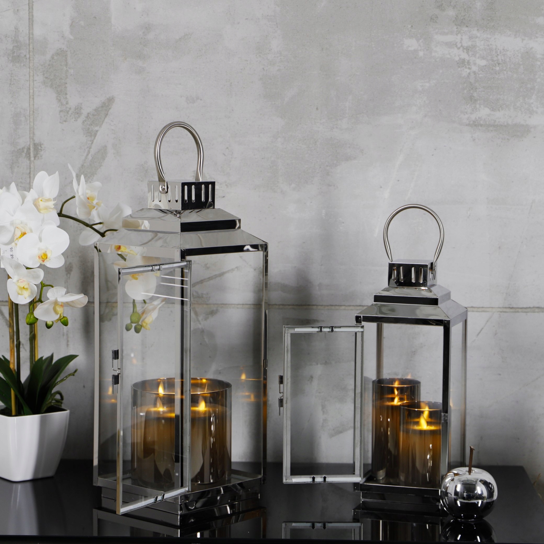 Представляем Вам элегантный металлический набор больших серебряных фонарей из нержавеющей стали >. В наборе 2 фонаря: большой и поменьше. Фонари имеют открывающиеся передние дверцы, внутри них можно разместить натуральные или светодиодные свечи, имеющиеся на других наших аукционах, или другие украшения или композиции. Фонарики также имеют ручки для удобной переноски или подвешивания. Боковые стороны всех фонарей застеклены.