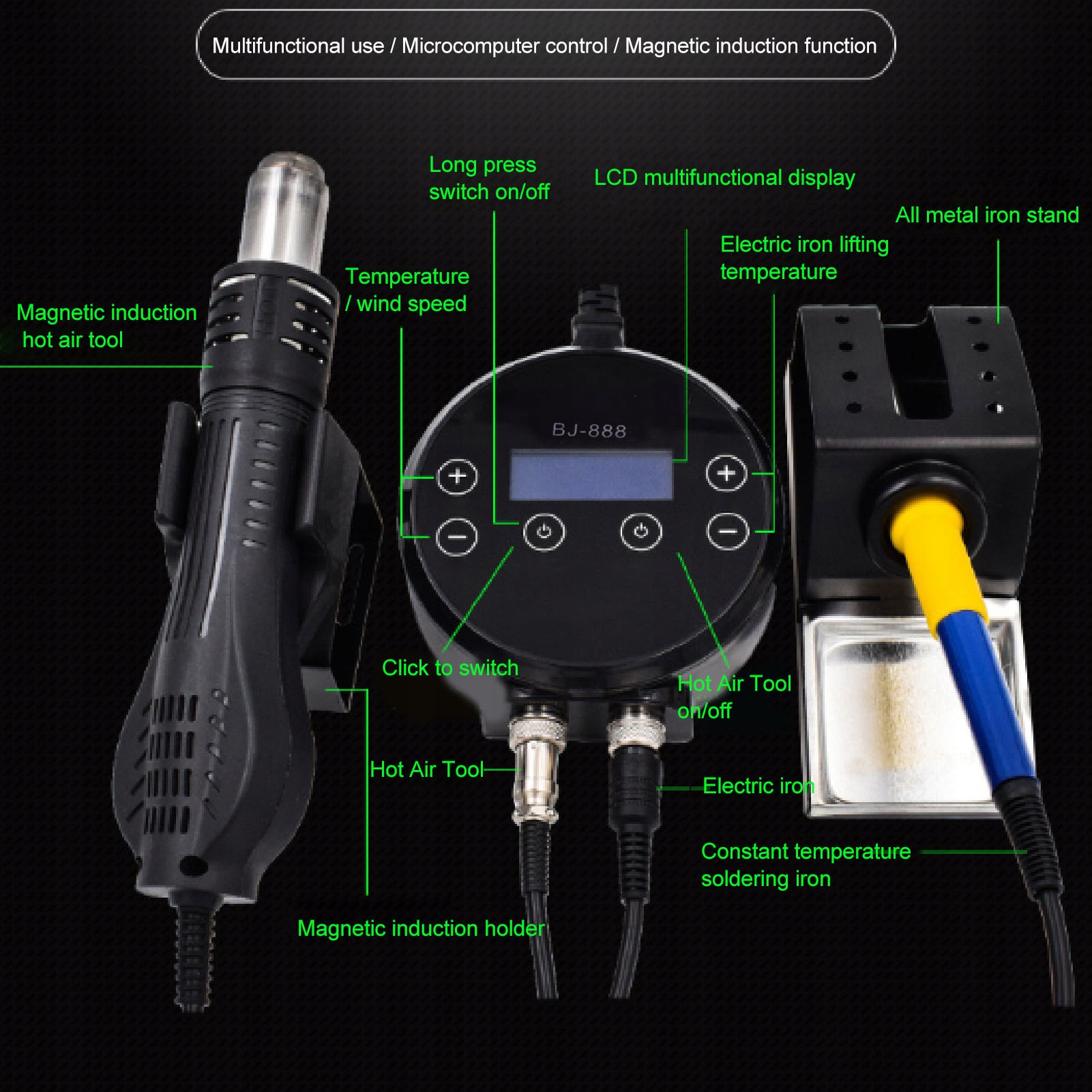 1. Интеллектуальный контроль температуры: набор паяльной станции для горячего воздуха имеет интеллектуальное управление температурой. После достижения заданной температуры нагрев останавливается и снова калибрует при падении температуры, сохраняя оптимальную эффективность.