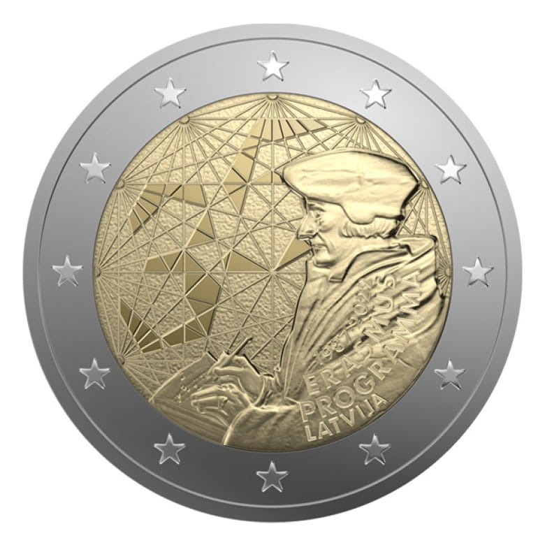 2 евро 2022 года, посвященные 35-летию программы Erasmus. На монете изображен философ Эразм Роттердамский во время письма. На заднем плане многочисленные линии соединяются в разных точках, символизируя многочисленные интеллектуальные и человеческие обмены между европейскими студентами. Среди этих строк также появляется цифра 35, выполненная в современном графическом стиле и символизирующая тридцать пятую годовщину программы Erasmus.