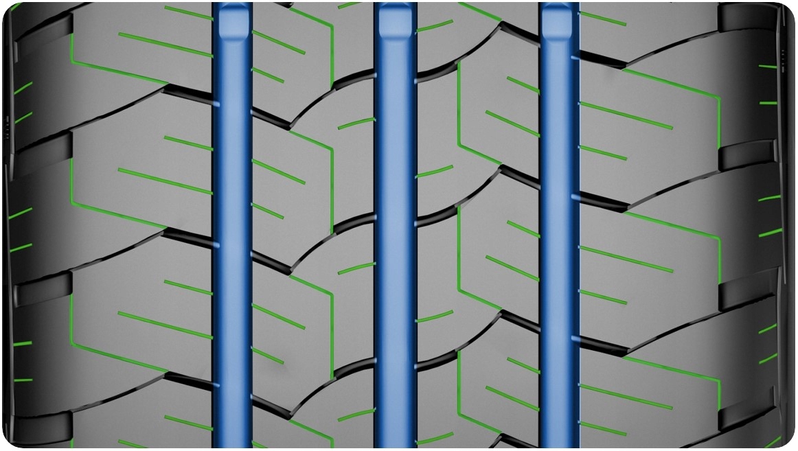 - Оптимизированное расположение ламелей и три продольные канавки обеспечивают рисунок протектора, оптимизирующий уровень шума.